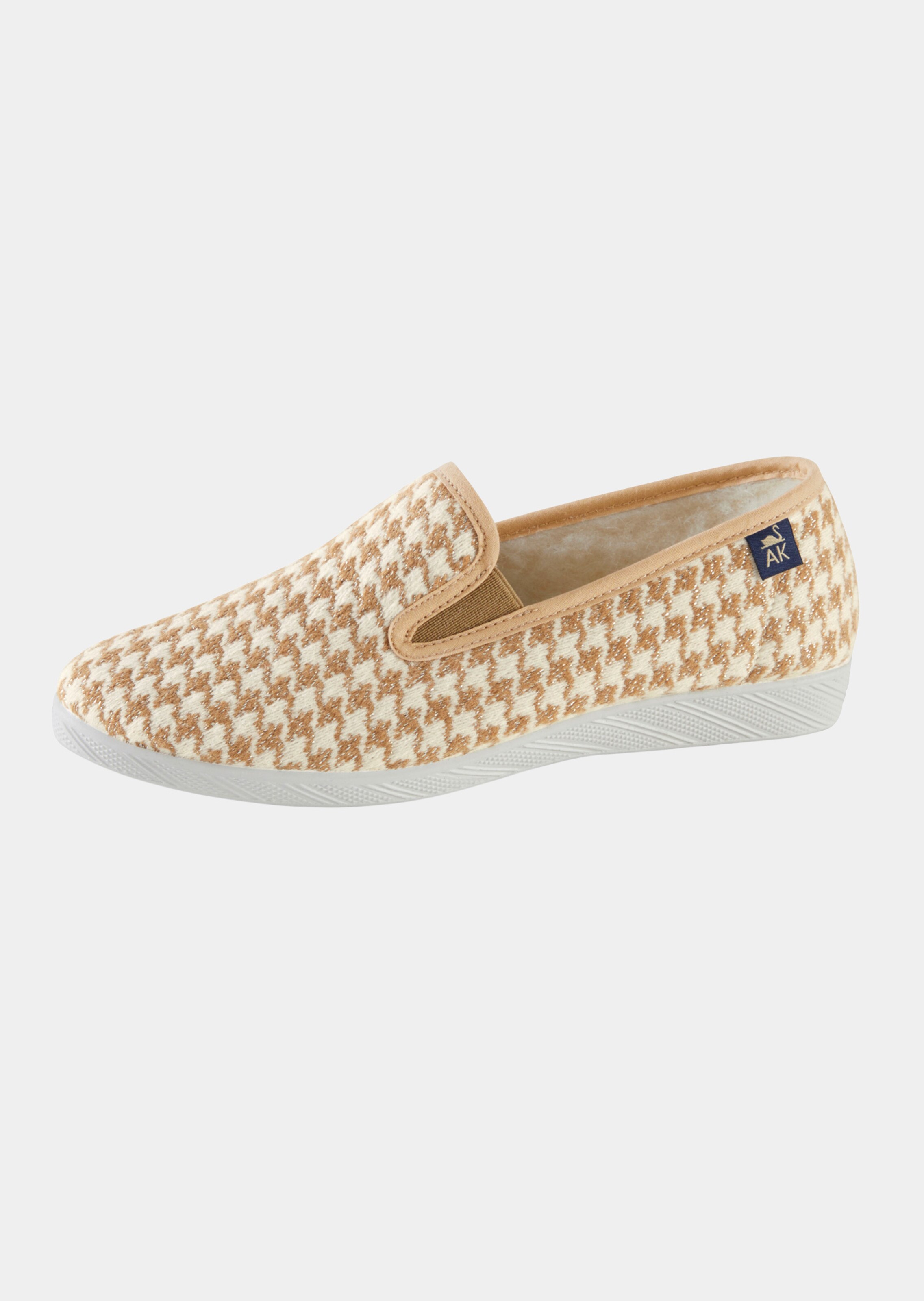 Hausschuhe in F-Weite – die schmale Slipperform passt optimal für schlanke Füße. Das Obermaterial aus Textil beeindruckt mit einem klassischen Hahnentrittmuster. Innen sorgen Futter und Decksohle aus reiner Schurwolle für angenehm warme Füße. Mit rutschsicherer Laufsohle aus echtem Kautschuk.