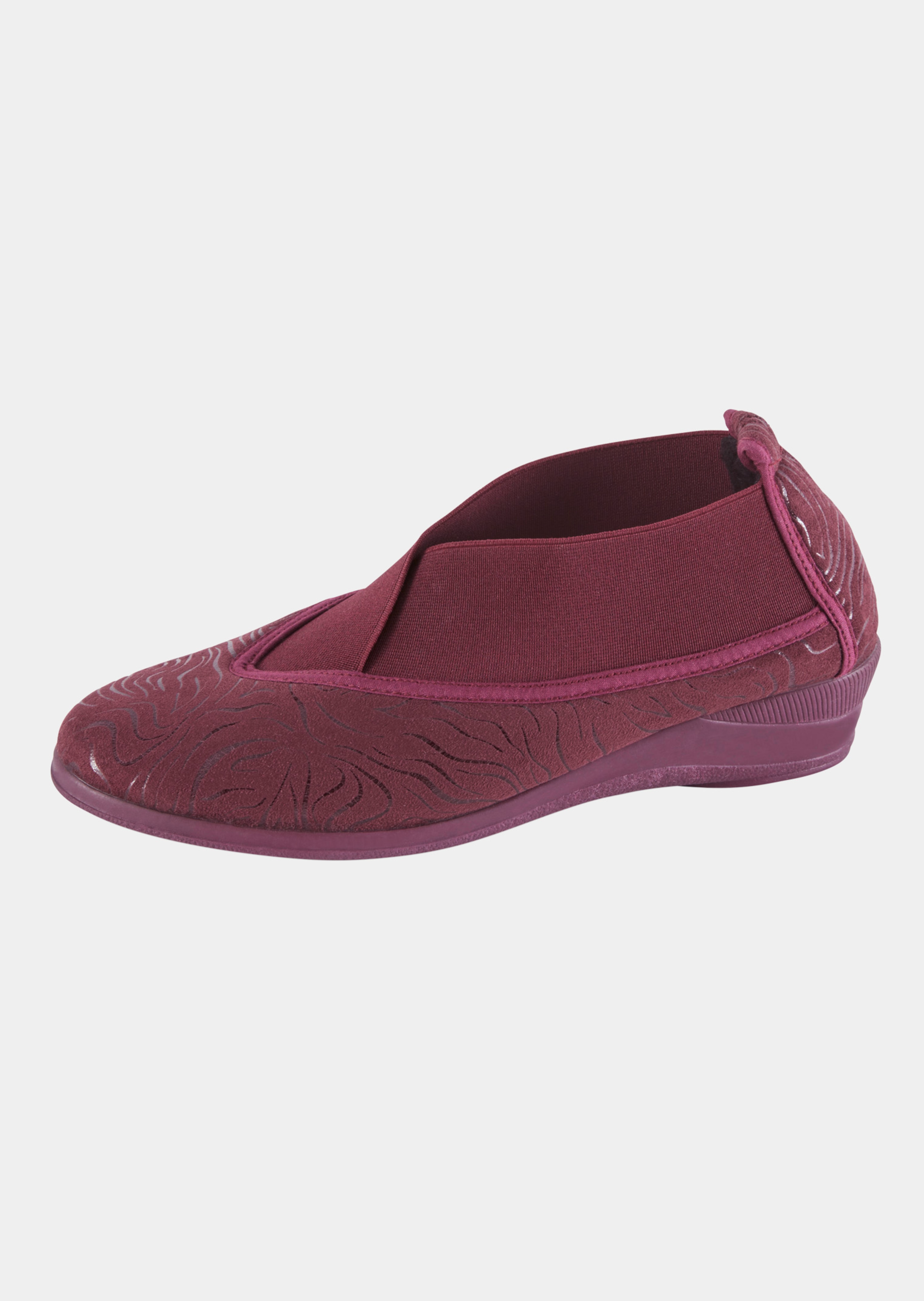 Hausschuhe in G-Weite in einzigartiger Passform – dafür sorgt der breite Gummizug über dem Spann. So bleibt der Schuh fest am Fuß und gibt sicheren Halt. Die gemütliche Schnitt bietet extra Komfort. Zum Blickfang wird das feminine Modell dank der eleganten Soft-Touch-Oberfläche im filigranen Dessin. Mit rutschsicherer Laufsohle aus echtem Kautschuk.