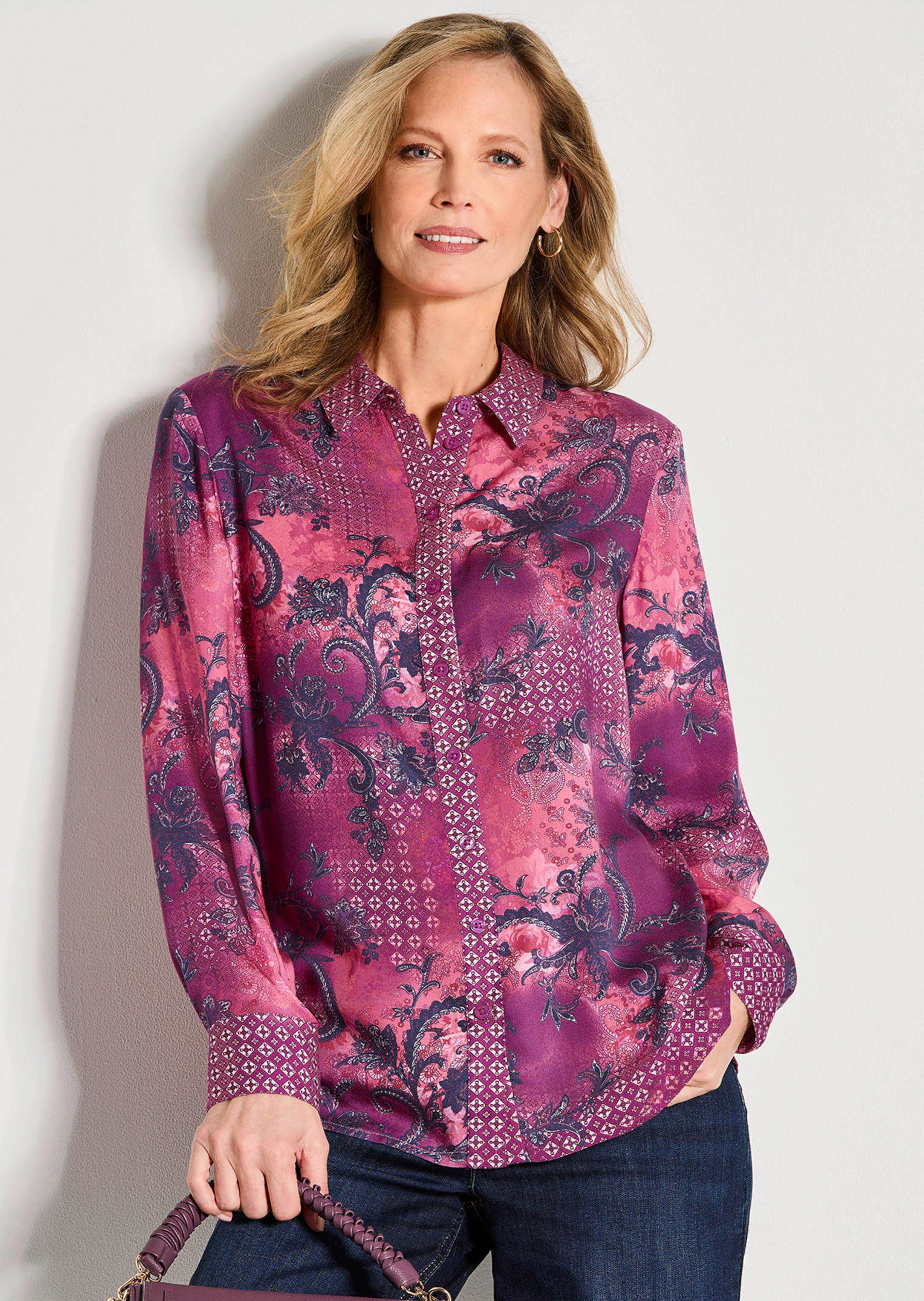 Druckbluse aus besonders weichem Viskose-Satin – der feine Glanz verleiht dem Modell eine edle Optik. Klassische Hemdblusenform mit Hemdkragen, durchgehender Knopfleiste und geknöpften Manschetten an den langen Ärmeln. Diese heben sich durch das geometrische Muster besonders vom übrigen Paisley-Patchdessin ab. Länge ca. 69 cm in Gr. 46, ca. 65 cm in Gr. 23.
