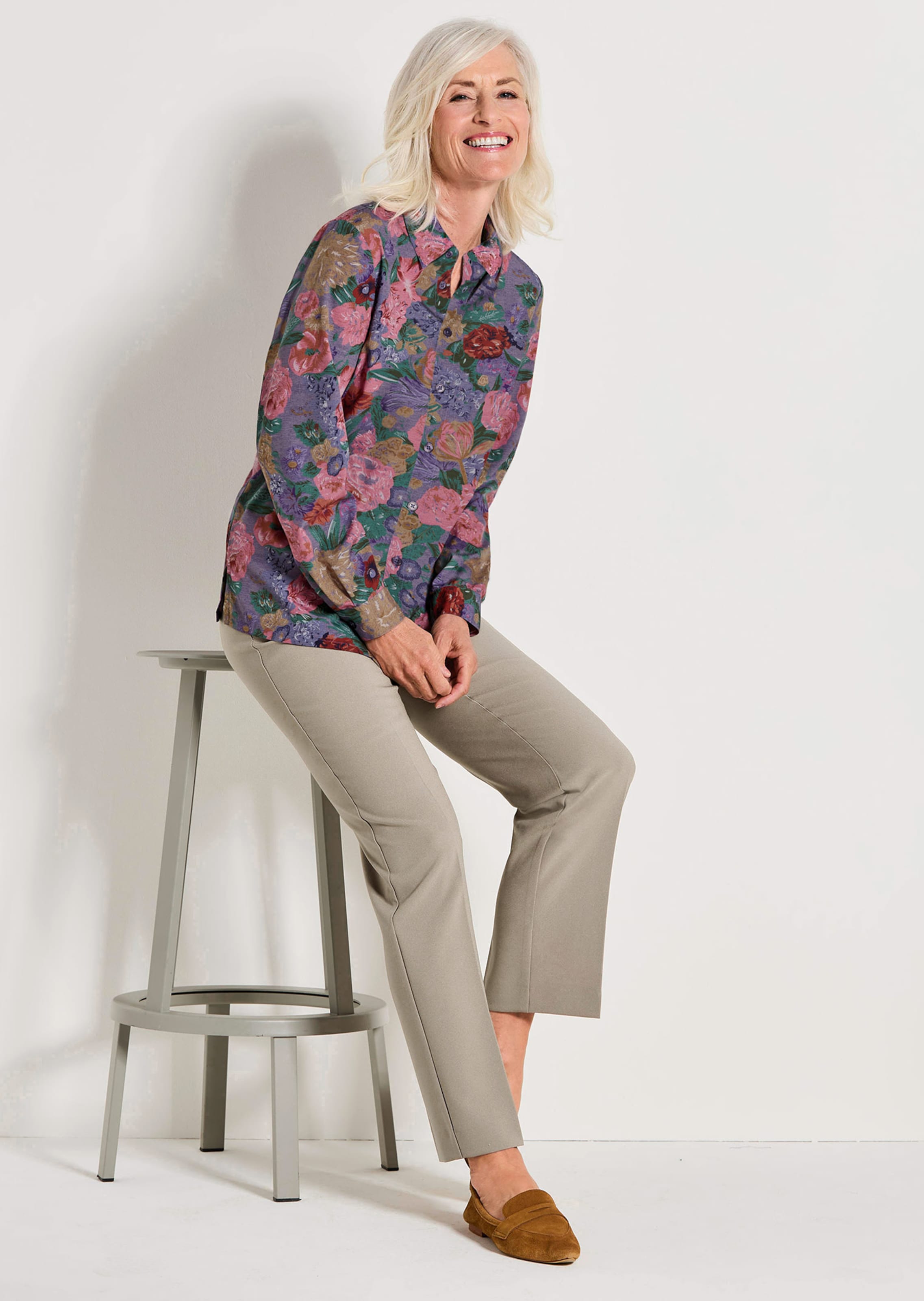 Druckbluse in klassischer Hemdblusenform mit Hemdkragen, Knopfleiste und langen Ärmeln mit Manschetten. Seitennahtschlitze sorgen für optimalen Bewegungskomfort. In pflegeleichter Waschen-Trocknen-Anziehen-Qualität, die kaum knittert und Sie überall hin begleitet. Das hübsche Blumenmuster verleiht Ihnen einen femininen Auftritt! Länge ca. 69 cm in Gr. 46, ca. 65 cm in Gr. 23.