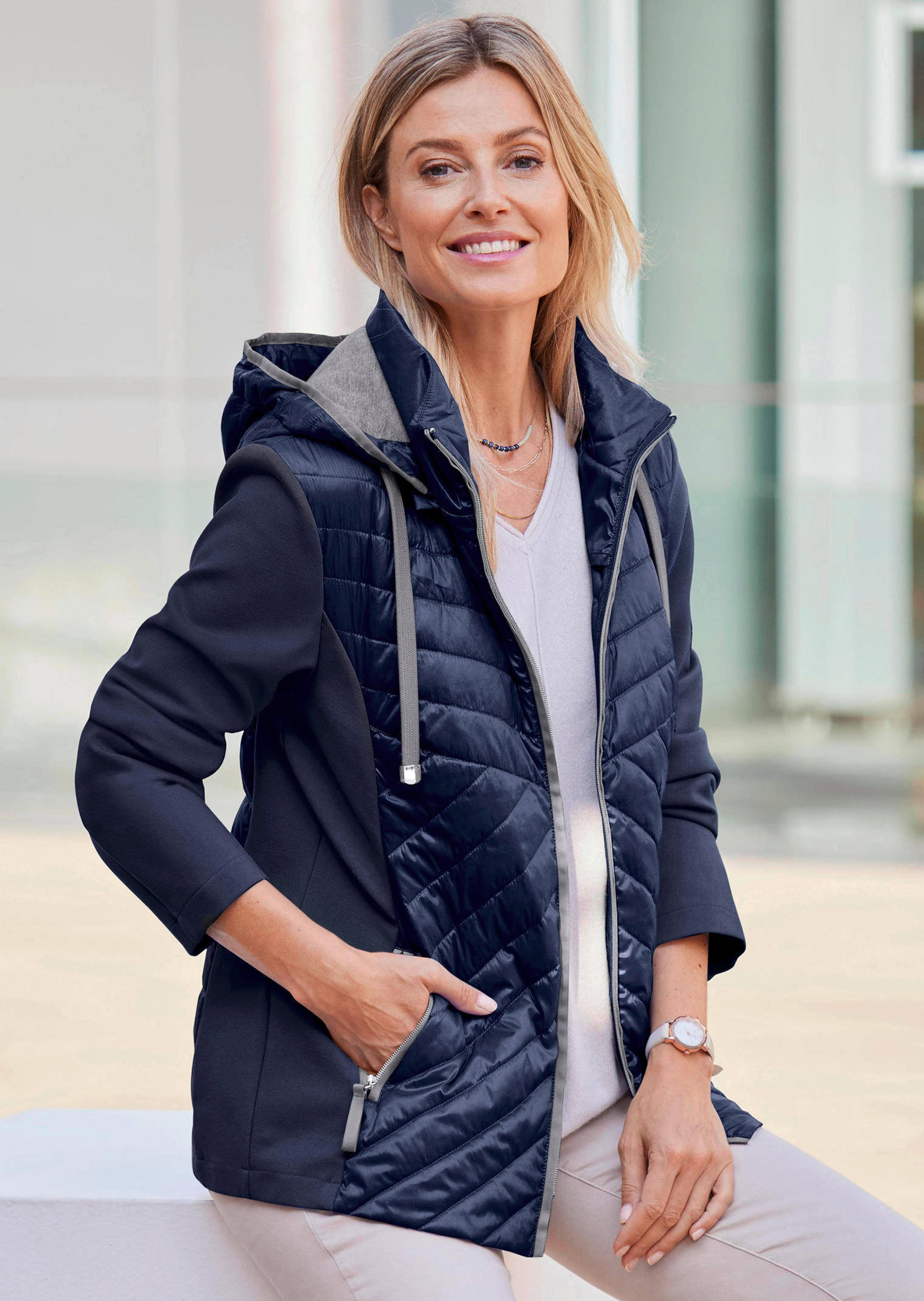 Jacke: Funktionalität trifft auf zeitgemäßes Design. Die abnehmbare Kapuze bietet zusätzlichen Schutz bei unbeständigem Wetter. Der tonig abgestimmte Materialmix aus stretchbequemer Jerseyqualität und dezent glänzender, gesteppter Webware sorgen für eine ansprechende Optik. Die leichte Wattierung bietet angenehme Wärme ohne aufzutragen. Sportive Details in Kontrastfarbe setzen modische Akzente. Formgebende Nahtführung für eine schmeichelhafte Silhouette. Länge ca. 69 cm in Gr. 46, ca. 65 cm in Gr. 23.