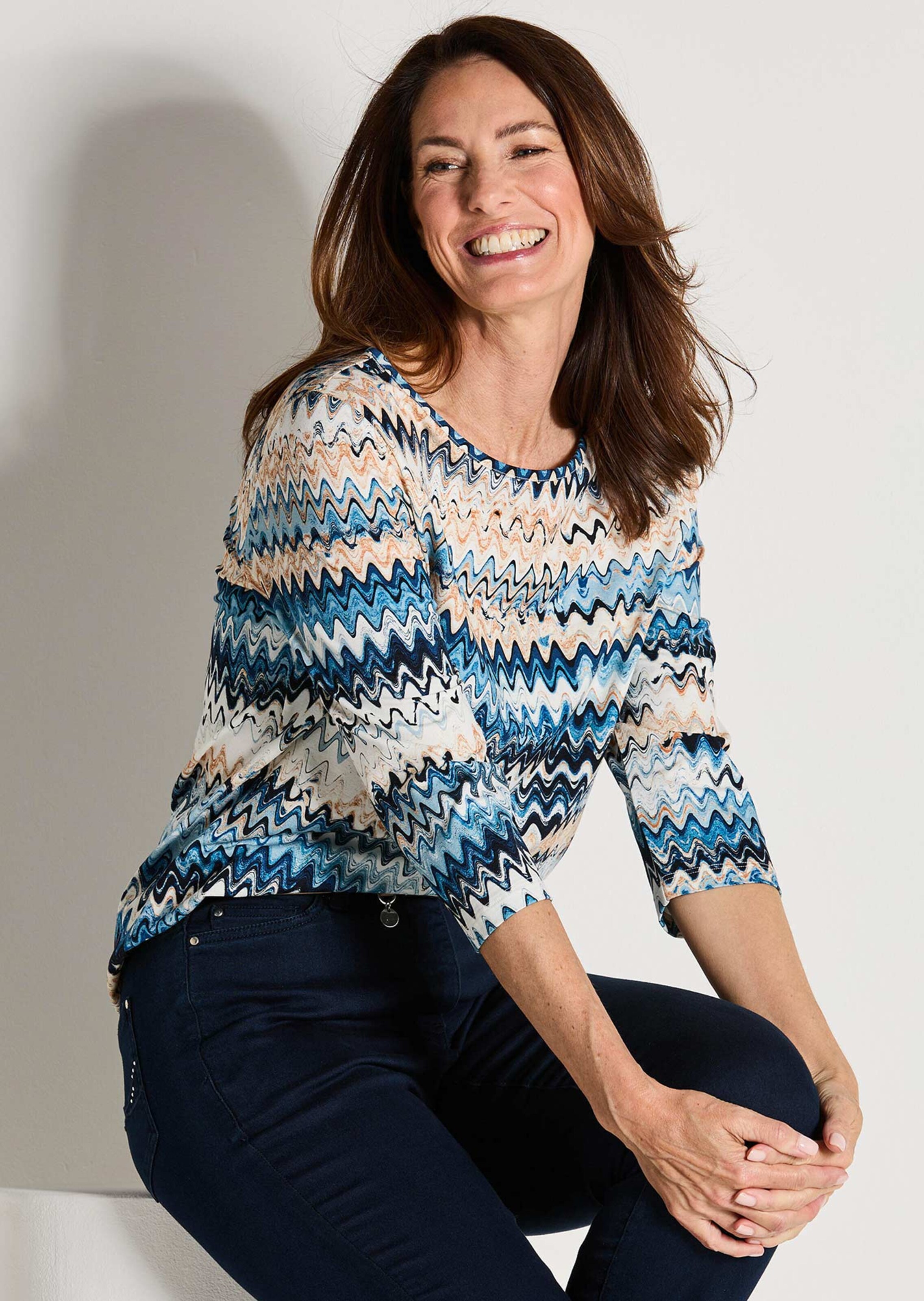 Druckshirt in verspieltem Zickzackmuster – der spannende Farbverlauf bringt Schwung ins Dessin und macht das Shirt zum neuen Favoriten für Ihre Lieblingslooks! Aus einem weichen Viskose-Jersey, der sich angenehm tragen lässt. Mit schmal eingefasstem U-Boot-Ausschnitt, 3/4-Ärmeln, in gerader Passform. Länge ca. 64 cm in Gr. 46, ca. 60 cm in Gr. 23.