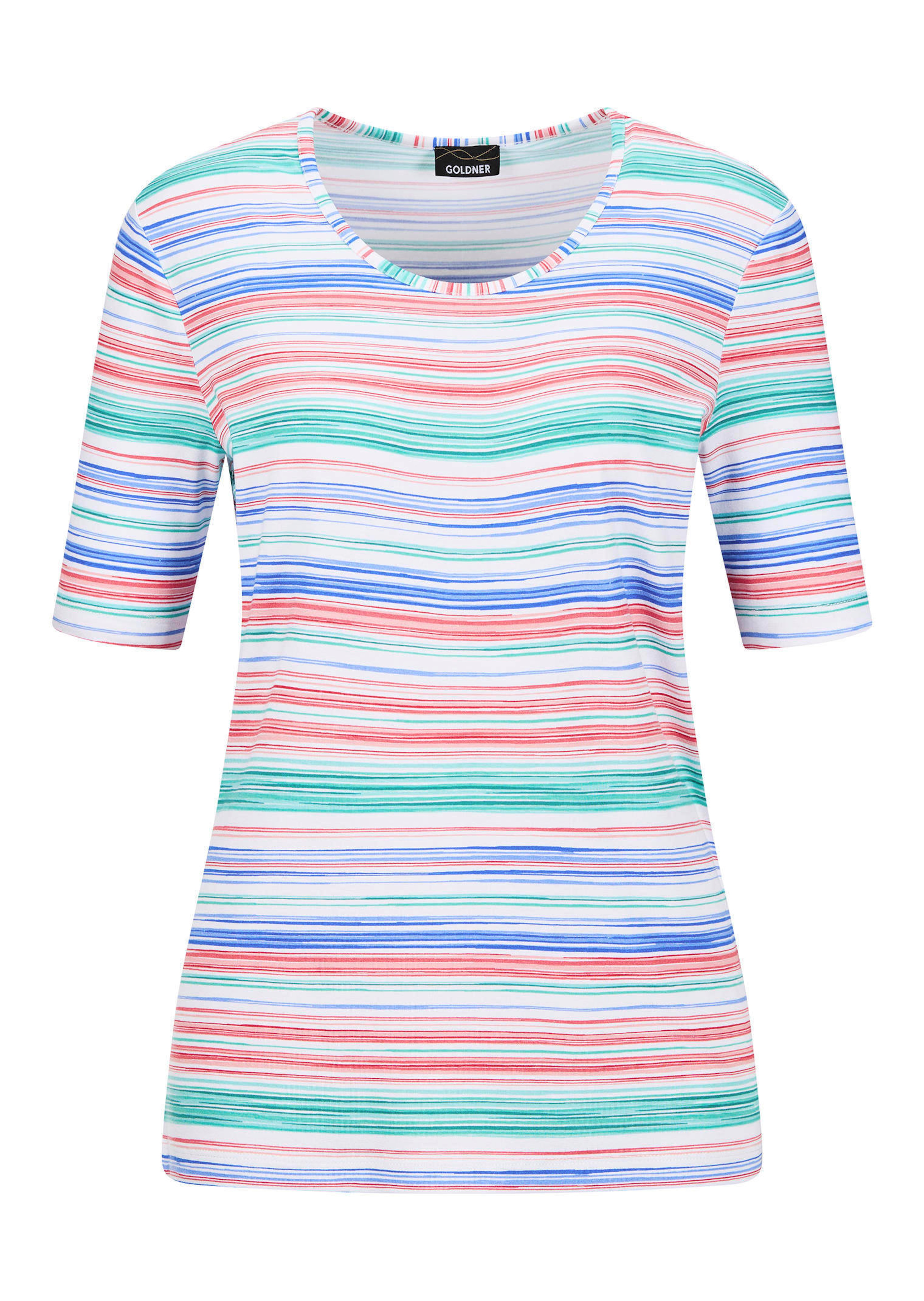 Shirt mit Streifenmuster in erfrischender Farbstellung. Die geschmeidige Viskosequalität mit Elasthan trägt sich weich und stretchbequem. Mit komfortablem Rundhalsausschnitt und Halbarm. Länge ca. 64 cm in Gr. 46, ca. 60 cm in Gr. 23.