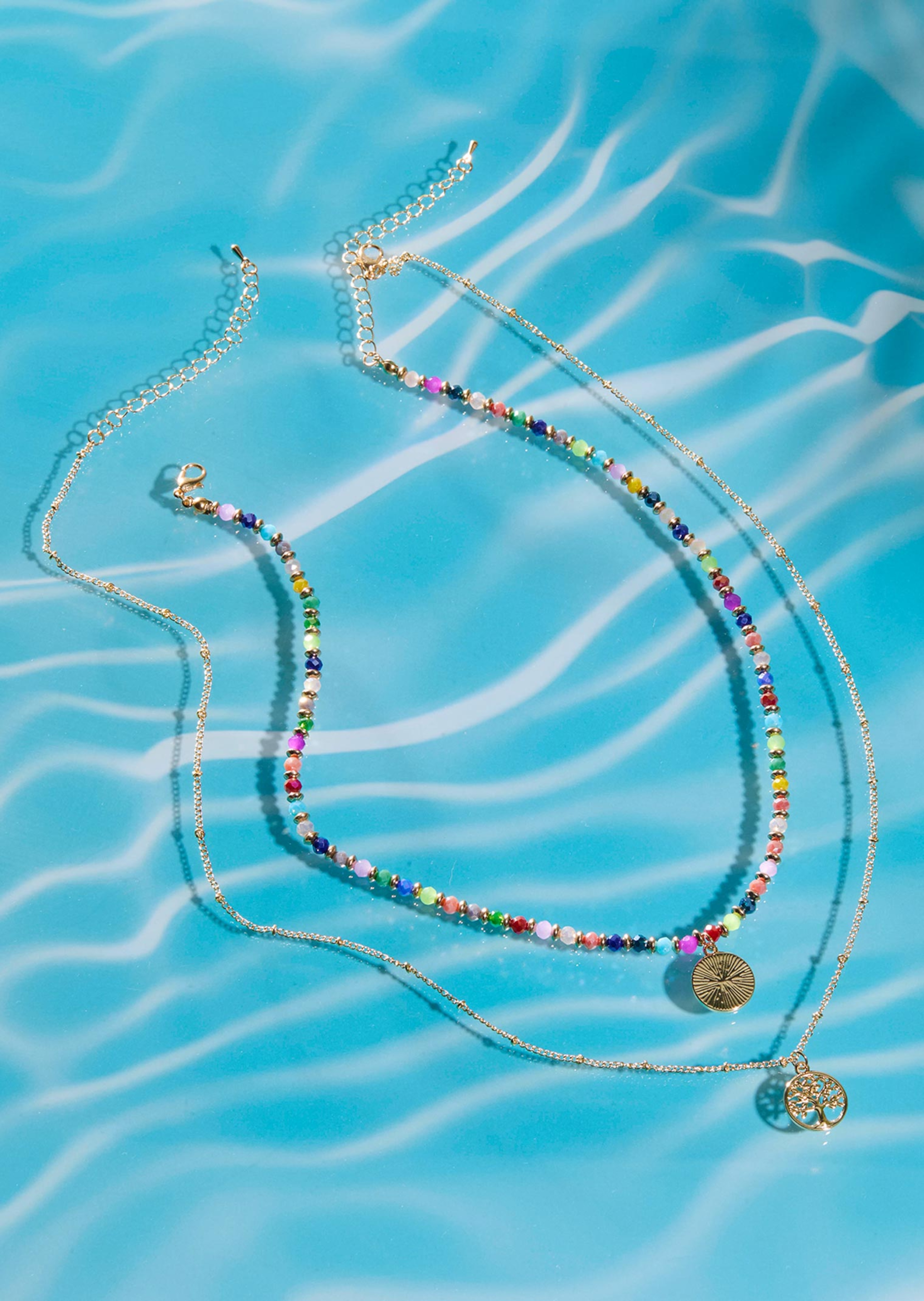 Ketten-Set aus zwei Ketten, die Sie zusammen, aber auch einzeln tragen können. Die kurze Kette fällt mit bunten Glassteinchen und einem kleinen, vergoldeten Medaillon sofort ins Auge. Die lange, feine Gliederkette aus goldfarbigem Edelstahl ziert ein edler Lebensbaumanhänger. Mit diesem Set haben Sie für jede Gelegenheit genau den richtigen Schmuck zur Hand und können nach Lust und Laune kombinieren. Länge Glasperlenkette: 42 cm + 7 cm Verlängerung, Länge Gliederkette: 60 cm + 7 cm Verlängerung. Beide Ketten mit Karabinerverschluss.