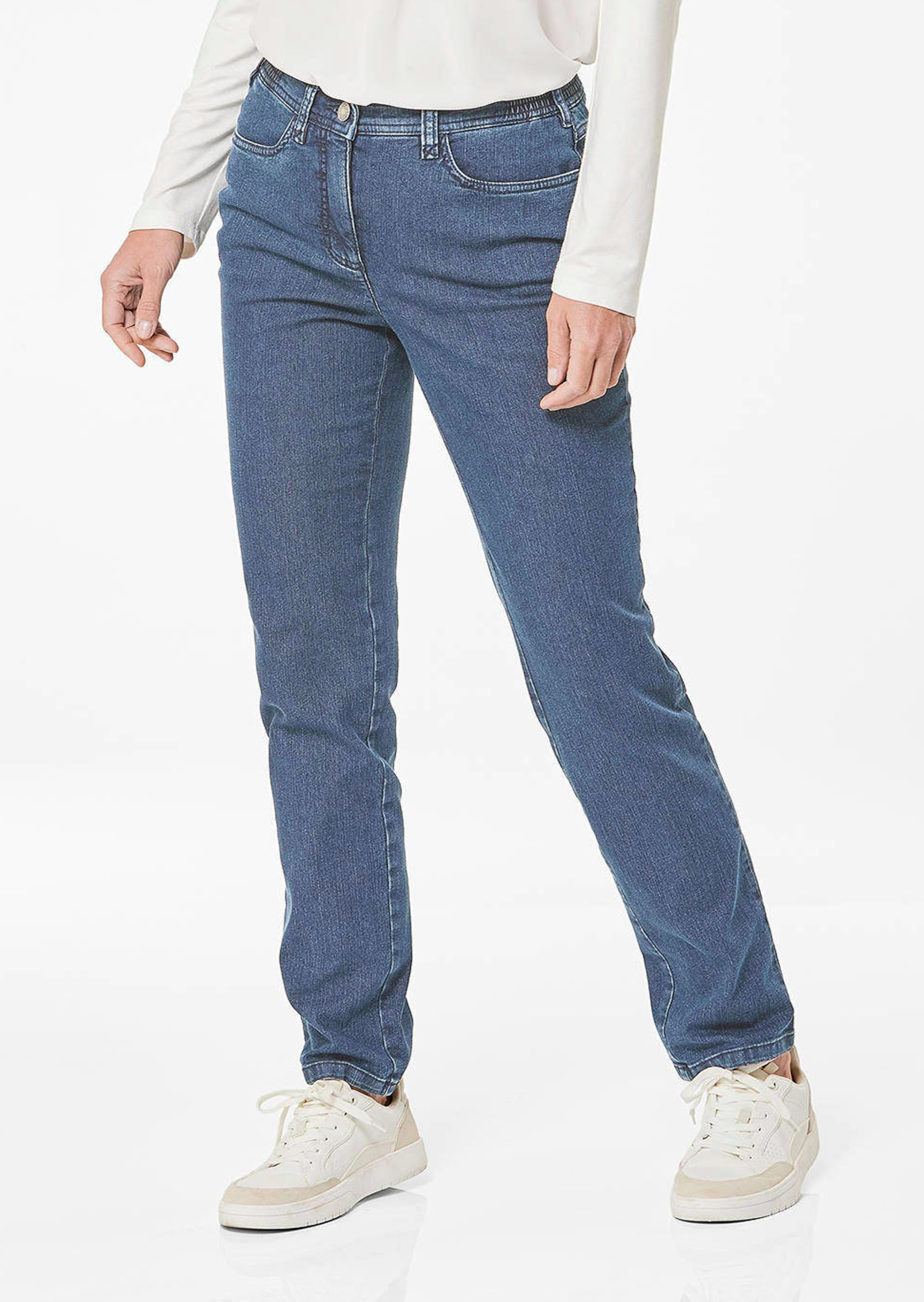 Jeanshose LOUISA mit seitlichem Dehnbund. Die innovative Stretchqualität macht die Hose in jede Richtung dehnbar, erlaubt höchste Bewegungsfreiheit und garantiert allerbesten Tragekomfort. Mit abgerundeten Eingriffstaschen vorne und mit Nieten verzierten Gesäßtaschen hinten. Der rückwärtige Sattel sorgt für einen guten Sitz. Ohne Gürtel. Saumweite LOUISA ca. 40 cm. Schmaler Beinverlauf.