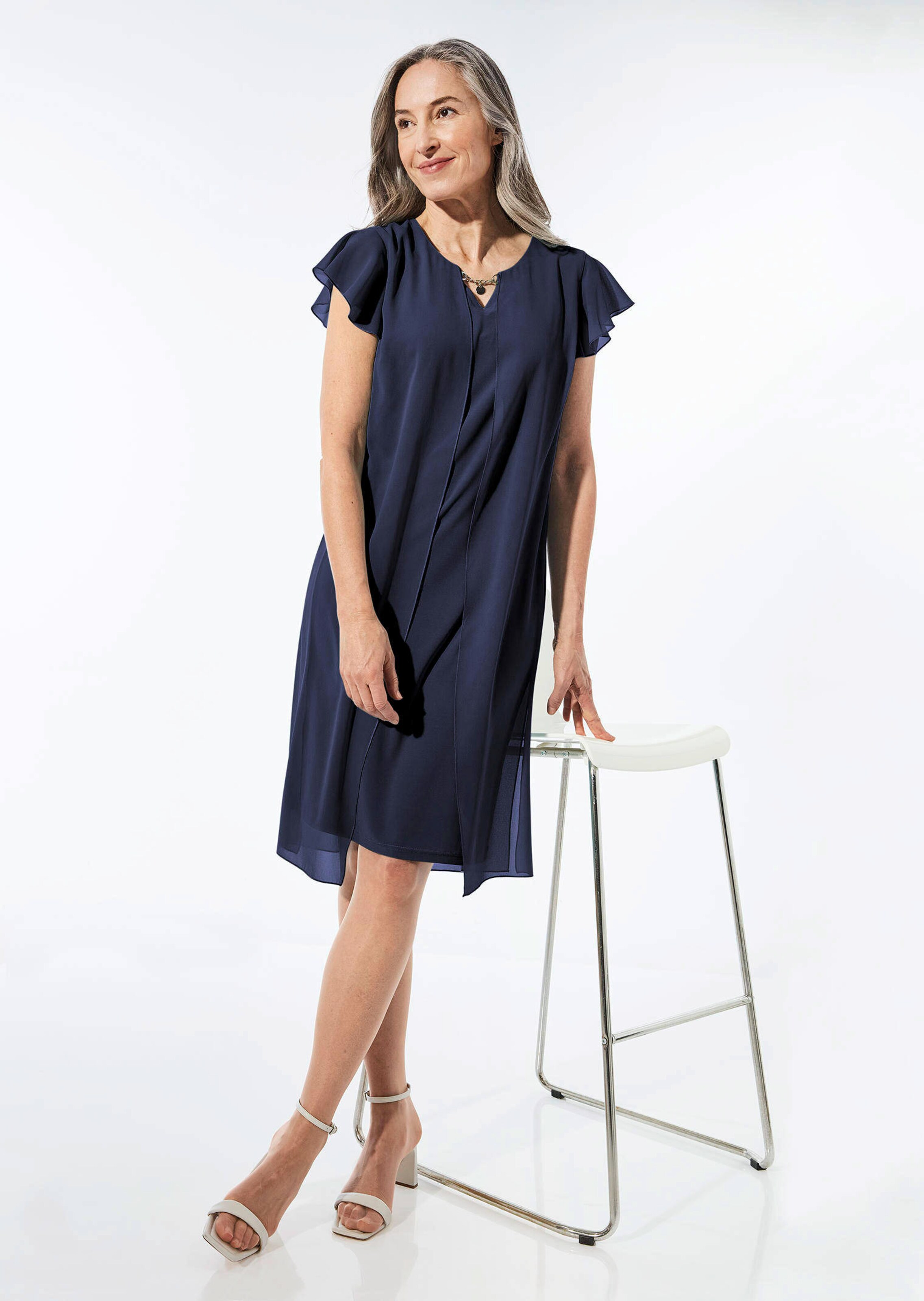 Kleid in schöner Etuiform und doppellagiger Verarbeitung: Der hauchzarte Chiffonüberwurf versprüht jede Menge Eleganz – auch die kurzen, feminin verspielten Ärmel sind aus feiner Chiffonware gearbeitet und machen die elegante Optik perfekt. Ein hübsches Dekoelement betont den Ausschnitt. Rückseite mit Reißverschluss. Länge ca. 102 cm in Gr. 46, ca. 96 cm in Gr. 23.