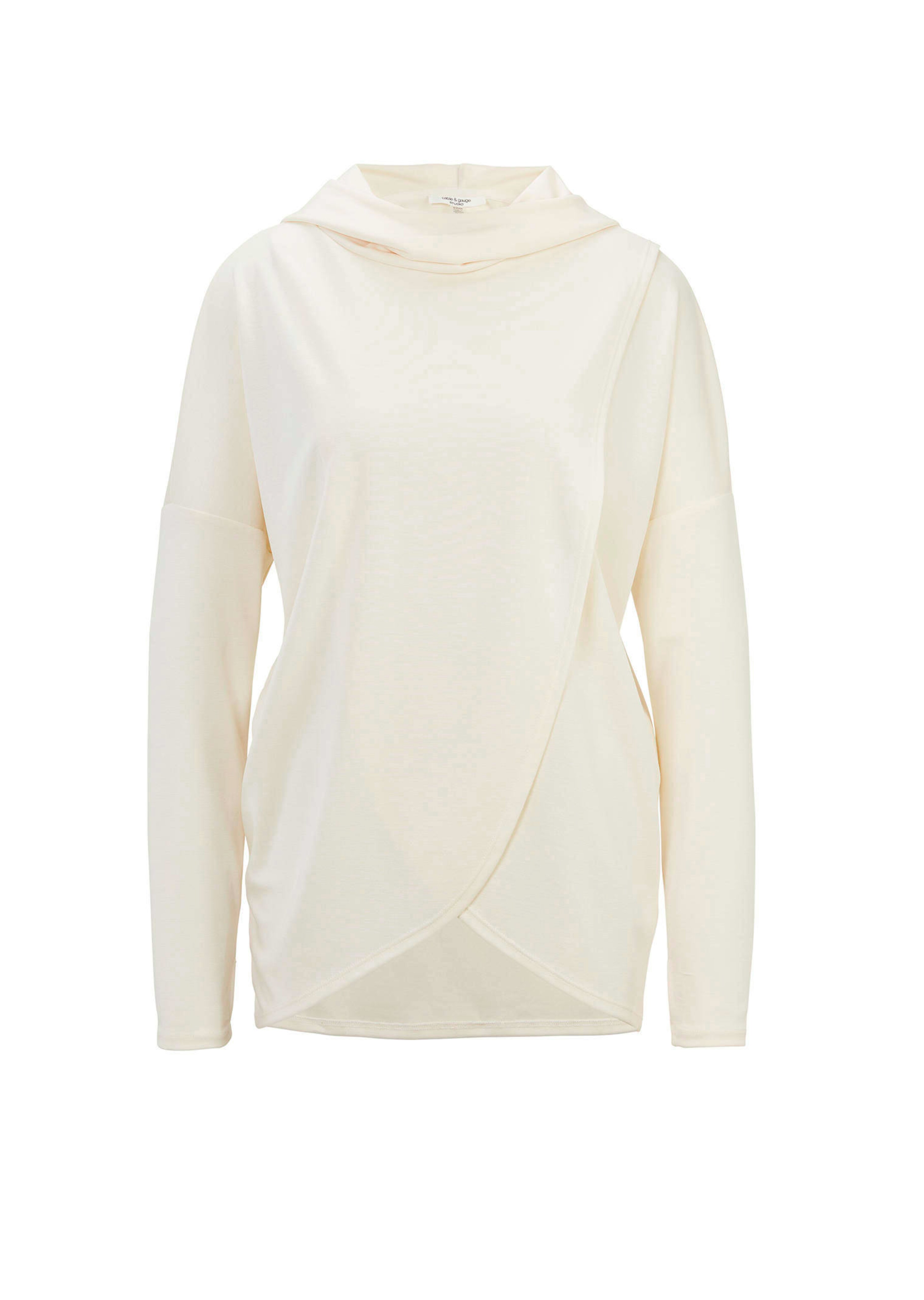Langarmshirt im raffinierten Tulpen-Schnitt, der sich im Vorderteil überlappt und dadurch perfekt kaschiert. Das Modell garantiert Ihnen volle Bewegungsfreiheit und Komfort. Die überschnittenen Ärmel in Überlänge enden mit einem Daumenloch, so bleiben auch die Handgelenke warm. Besonderes Highlight ist der lässige Kragen, der im Rückteil in einer Kapuze endet. Aus einer weichen Qualität mit viel Modal ist das Langarmshirt perfekt für gemütliche Stunden zu Hause oder auch für entspannte Ausflüge!