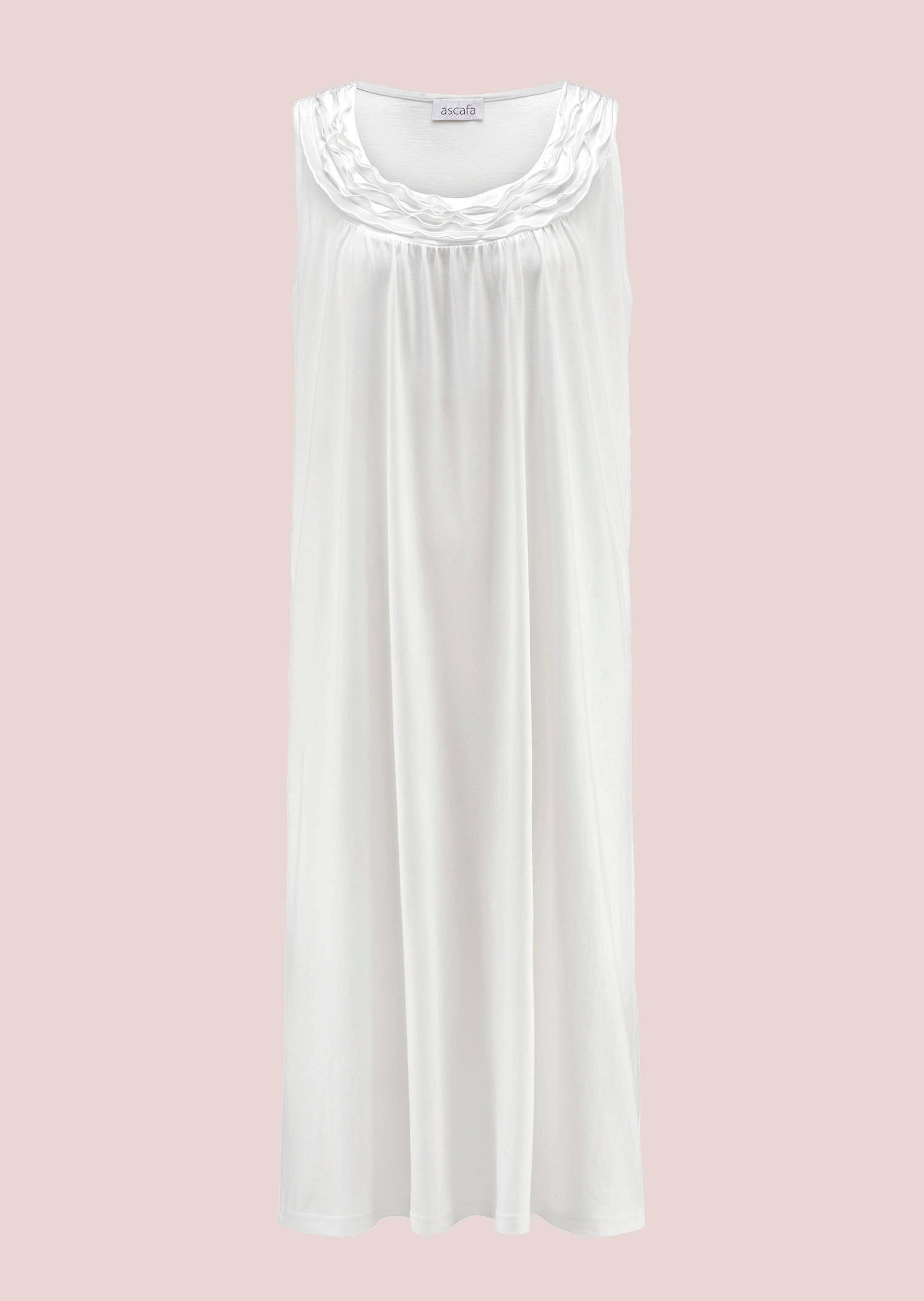 Das Nachthemd von ASCAFA vereint Komfort und raffinierte Details. Die hochwertige Baumwoll-Modal-Qualität fühlt sich sanft auf der Haut an, während Wellenrüschen am Rundhalsausschnitt und die feine Raffung vorne für einen eleganten Look sorgen. Ärmellos paspeliert in längerer Schnittführung – ein zeitloser Klassiker für entspannte Nächte.