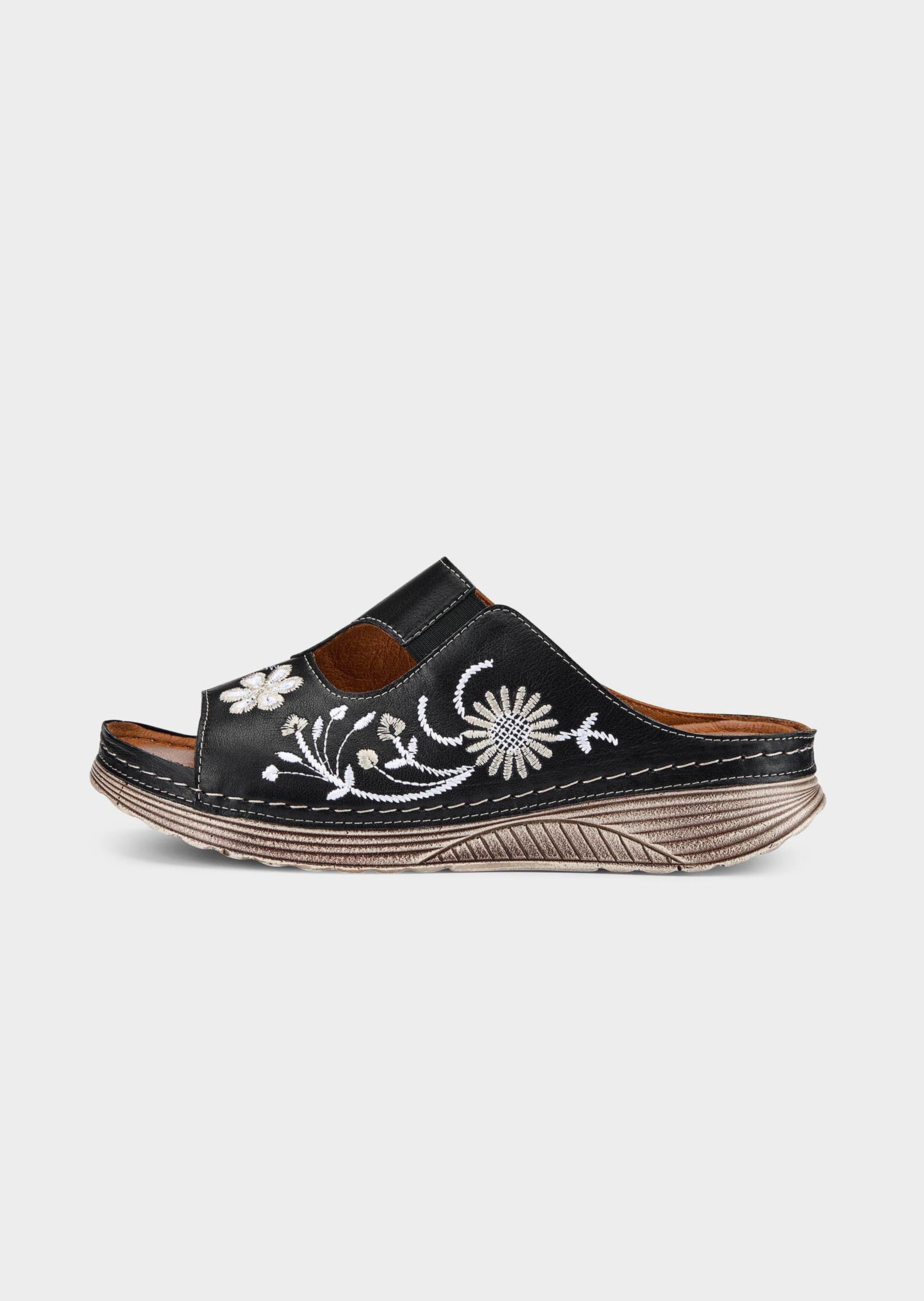 Pantoletten von GEMINI mit hübschen Blumenornamenten – ein femininer Sommerbegleiter in komfortabler G-Weite. Echtes Leder umfängt den Fuß angenehm weich. Mit dämpfender Synthetik-Laufsohle und einem 3,5 cm hohen Absatz.