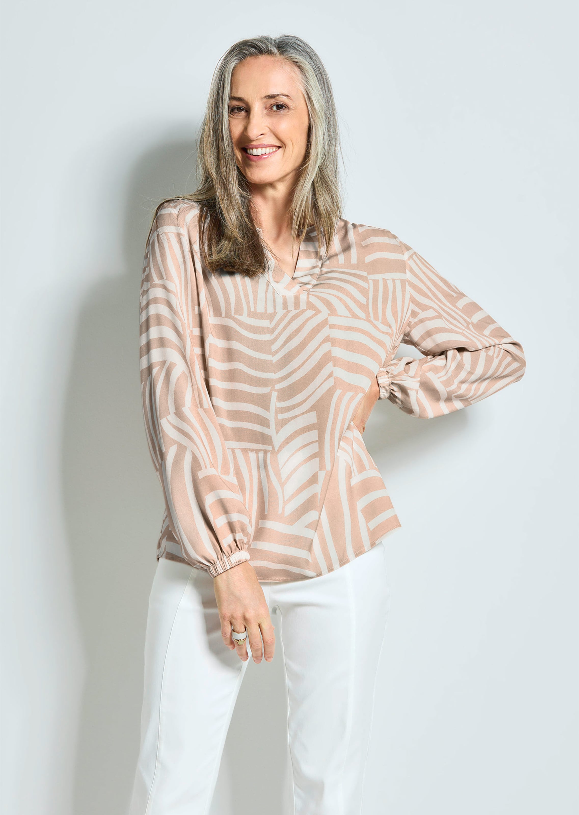 Bluse in grafischem Patchdruck – schwungvoll und kombistark. Der Rundhalsausschnitt mit Schlitz und breiter Blende zaubert ein schönes Dekolleté, während sich die langen Ärmel dank Gummibündchen prima hochschoppen lassen. Kleine Raffungen an der Schulternaht und im Rückteil sorgen für Mehrweite, die die Figur schön umspielt. Aus leichter, kühlender Viskose. Länge ca. 66 cm in Gr. 46, ca. 62 cm in Gr. 23.