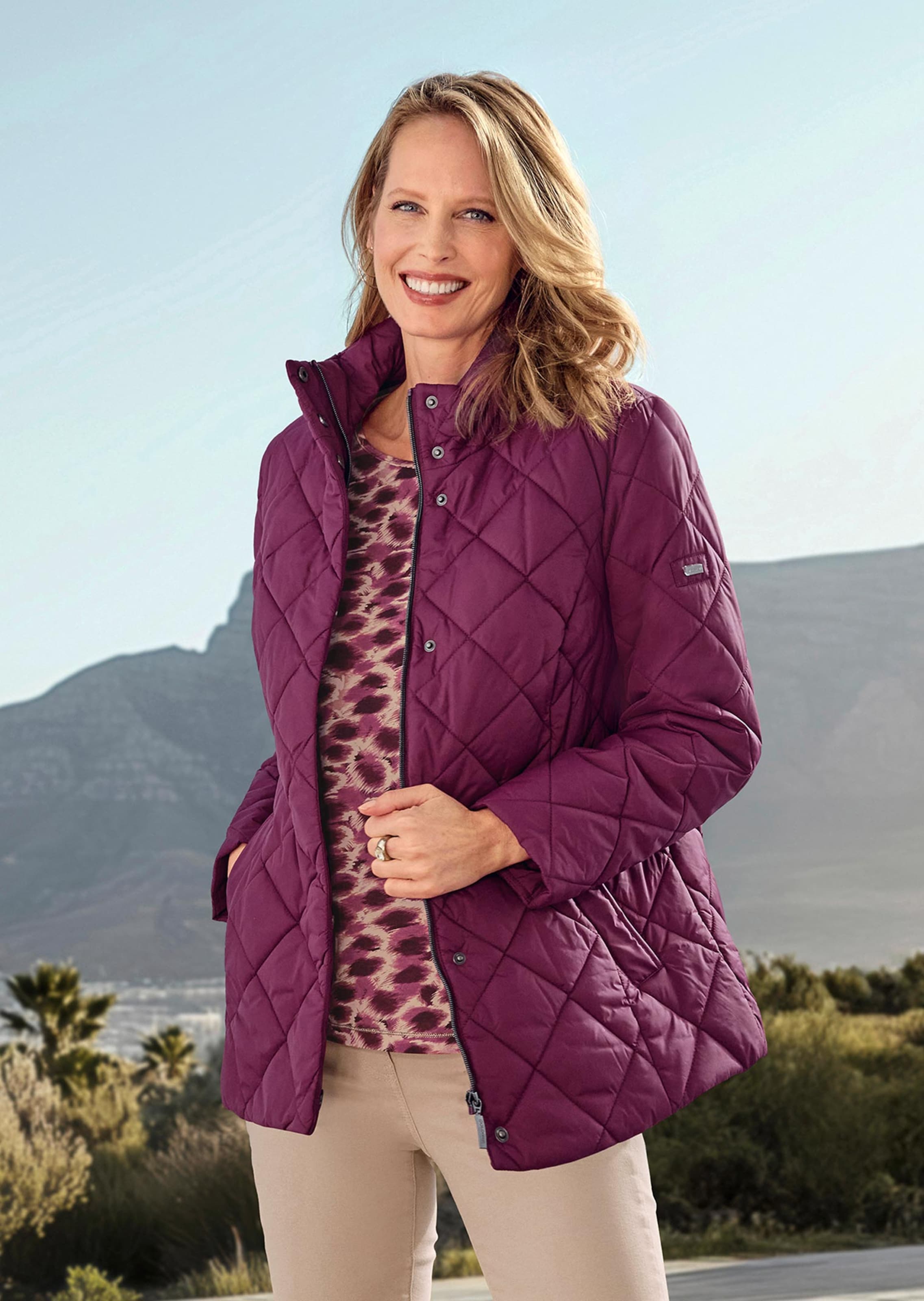 Steppjacke in moderner Optik mit angesagtem Rautenstepp. Die leichte Qualität mit wärmender Wattierung ist ideal für den Übergang. Mit Reißverschluss und Druckknöpfen zu schließen. Formgebende Wiener Nähte zaubern einen perfekten Sitz. Lässiger Schnitt mit abgerundetem Saum. Die Taschen sind mit Fleece gefüttert. Länge ca. 71 cm in Gr. 46, ca. 67 cm in Gr. 23.