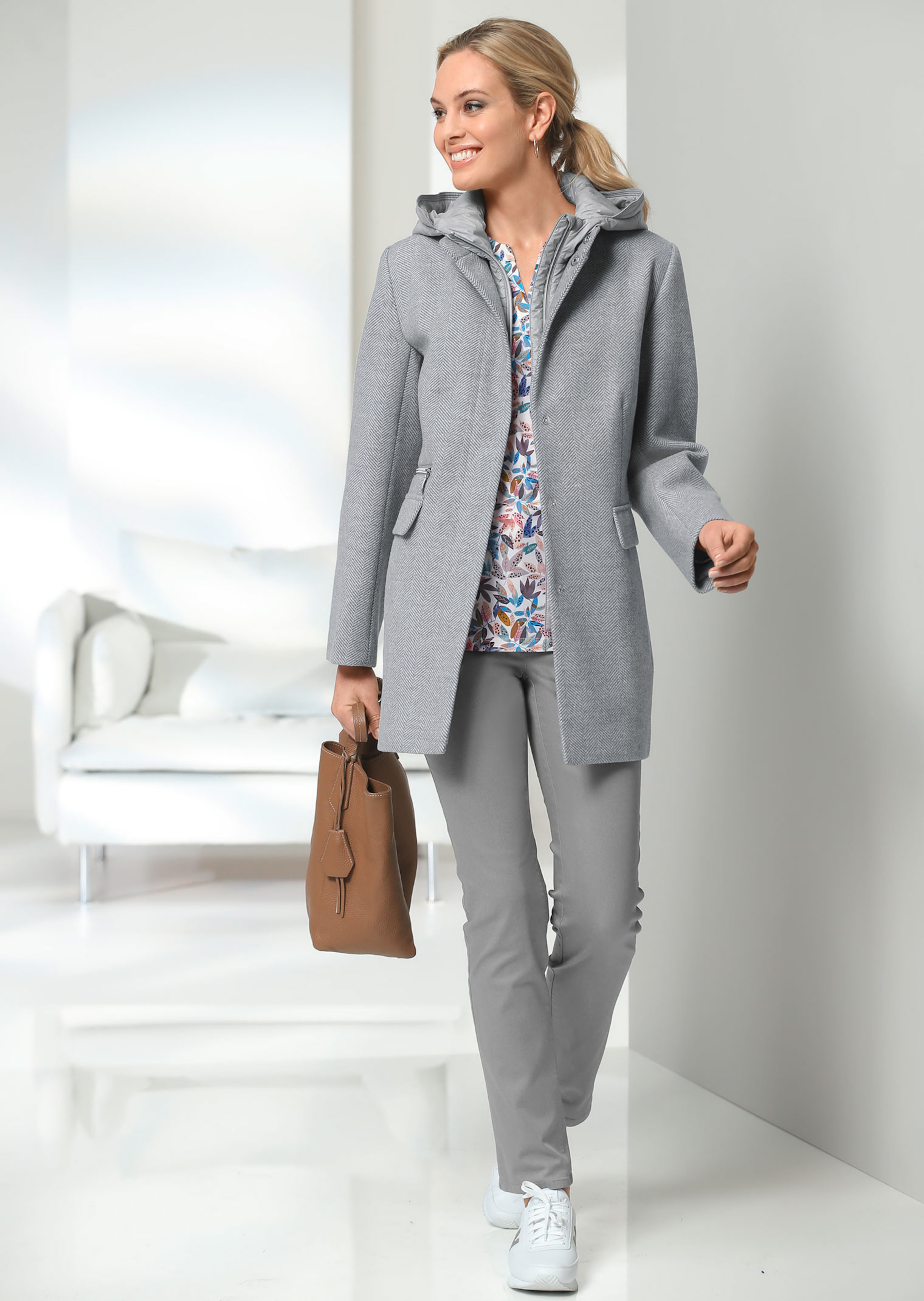 Eleganter Mantel in authentischer Wolloptik. Besonders praktisch: Dieser schöne Begleiter ist mit einem herausnehmbaren Steppeinsatz ausgestattet und lässt sich perfekt an die Temperaturen anpassen. Mit Kapuze, Pattentaschen, Reißverschluss und Gehschlitz auf der Rückseite für optimale Bewegungsfreiheit. Länge ca. 83 cm in Gr. 46, ca. 79 cm in Gr. 23.
