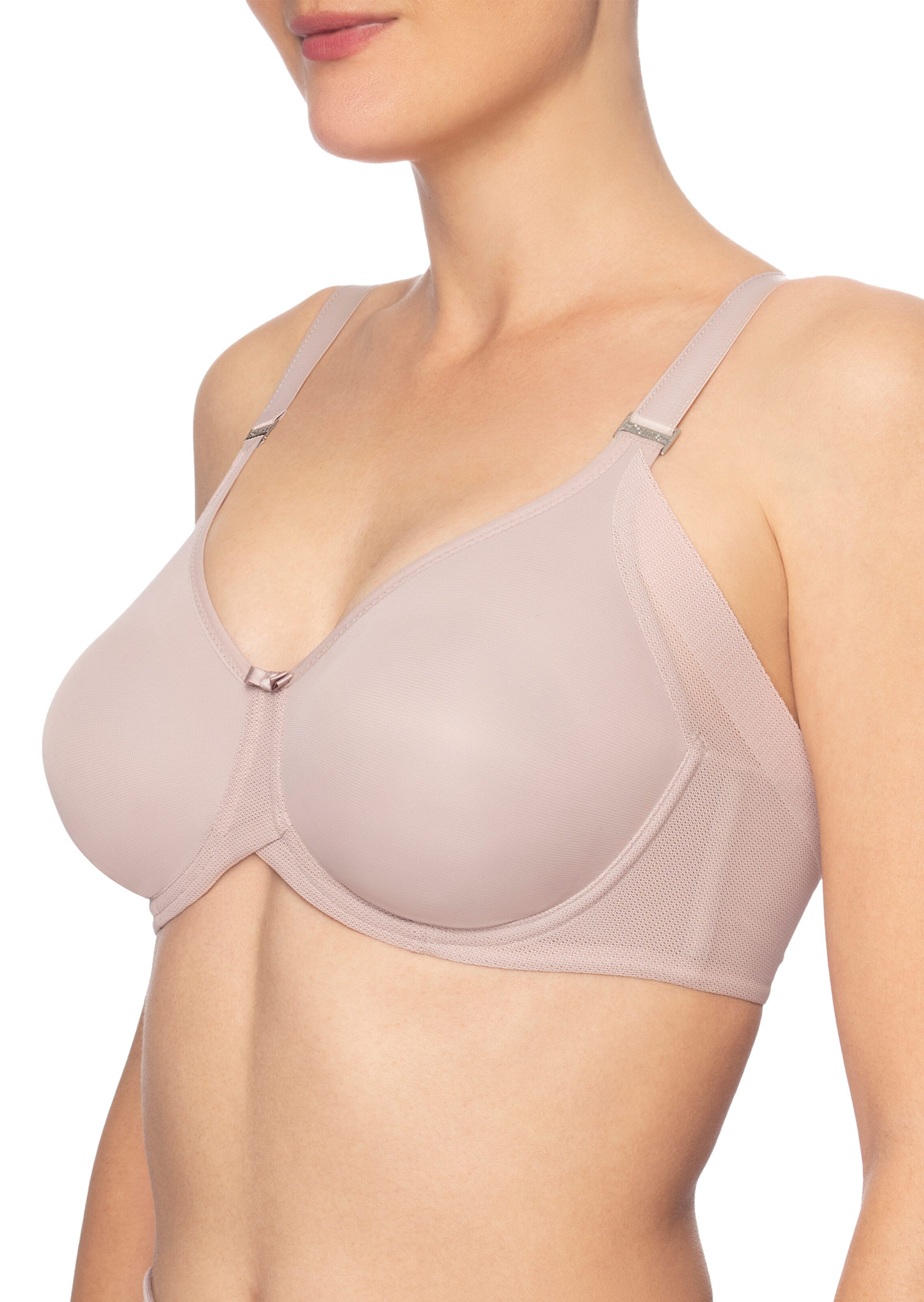 Minimizer Bügel-BH von Felina aus der Serie DIVINE VISION. Die komplett nahtlosen Cups aus weicher Mikrofaser, vorgeformt und in doppelter Stofflage gearbeitet, bieten die volle Unterstützung der Büste. Die außergewöhnliche Formgebung des BH-Rücken und der hochgezogenen Seitenteile garantieren einen guten Sitz. Rücken und Seitenteile sind aus unterfütterten luftigen Mesh gefertigt. Die etwas breiteren, elastischen Träger sind im Rücken längenverstellbar. Das moderne Modell verfügt über interessante Details, die den BH schlichte Eleganz verleihen: silberne Akzente, eine Überlappung auf dem Mittelsteg mit kleiner, schlichter Schleife und Träger in Satinoptik.
