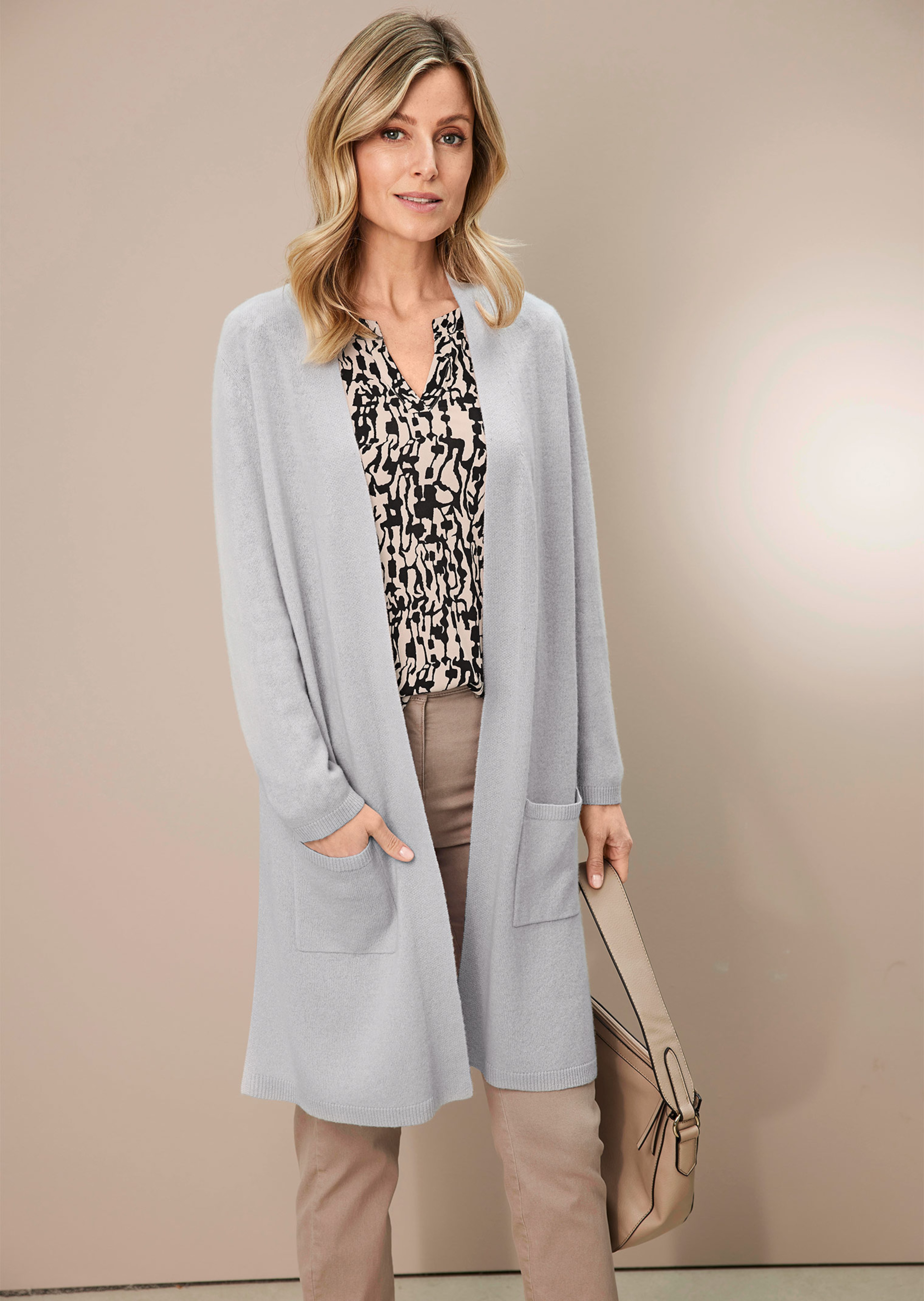 Kaschmir-Longstrickjacke, die durch ihren längeren Schnitt wunderbar angenehm zu tragen ist. Schlitze an den Seiten sorgen für uneingeschränkte Bewegungsfreiheit. Leicht überschnittene Schultern, aufgesetzte Taschen und ein leicht angestellter Kragen machen das wunderschöne Modell aus kuschelig weichem Kaschmir zu etwas ganz Besonderem und garantiert auch ganz schnell zu Ihrem neuen Lieblingsteil. Länge ca. 88 cm in Gr. 46, ca. 84 cm in Gr. 23.