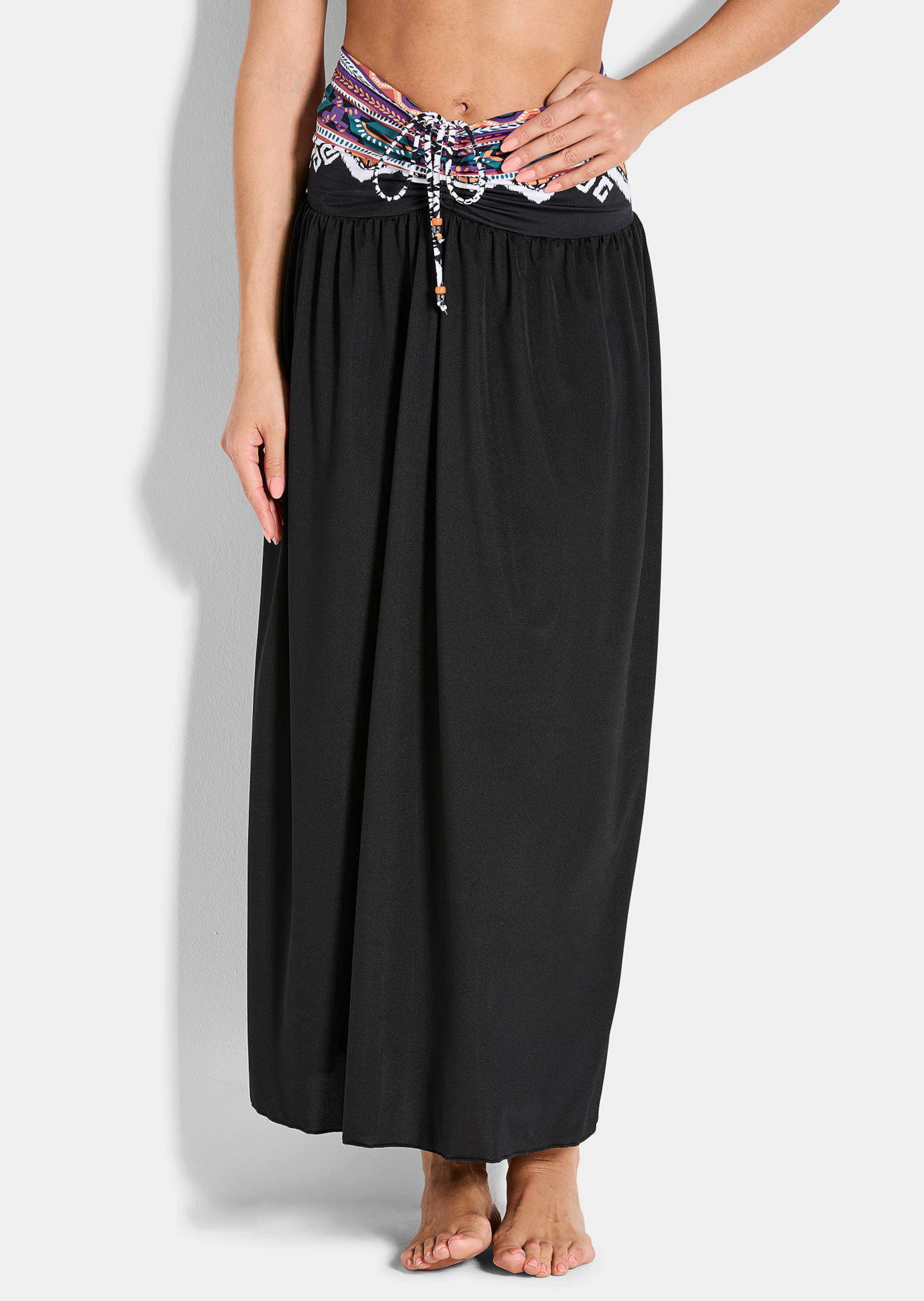 Multistyle-Rock von SUNFLAIR – bietet mehrere Tragemöglichkeiten: Als Neckholder-Kleid mit Bindeband oder mit umgelegtem Bund als Strandrock. Der breite, elastische Bund im Ethno-Muster lässt sich in der Mitte geschickt raffen. Ein vielseitiges Sommer-Piece, das sich im Handumdrehen neu stylen lässt – perfekt für Urlaub, Strand und auch einen Ausflug in die Stadt!