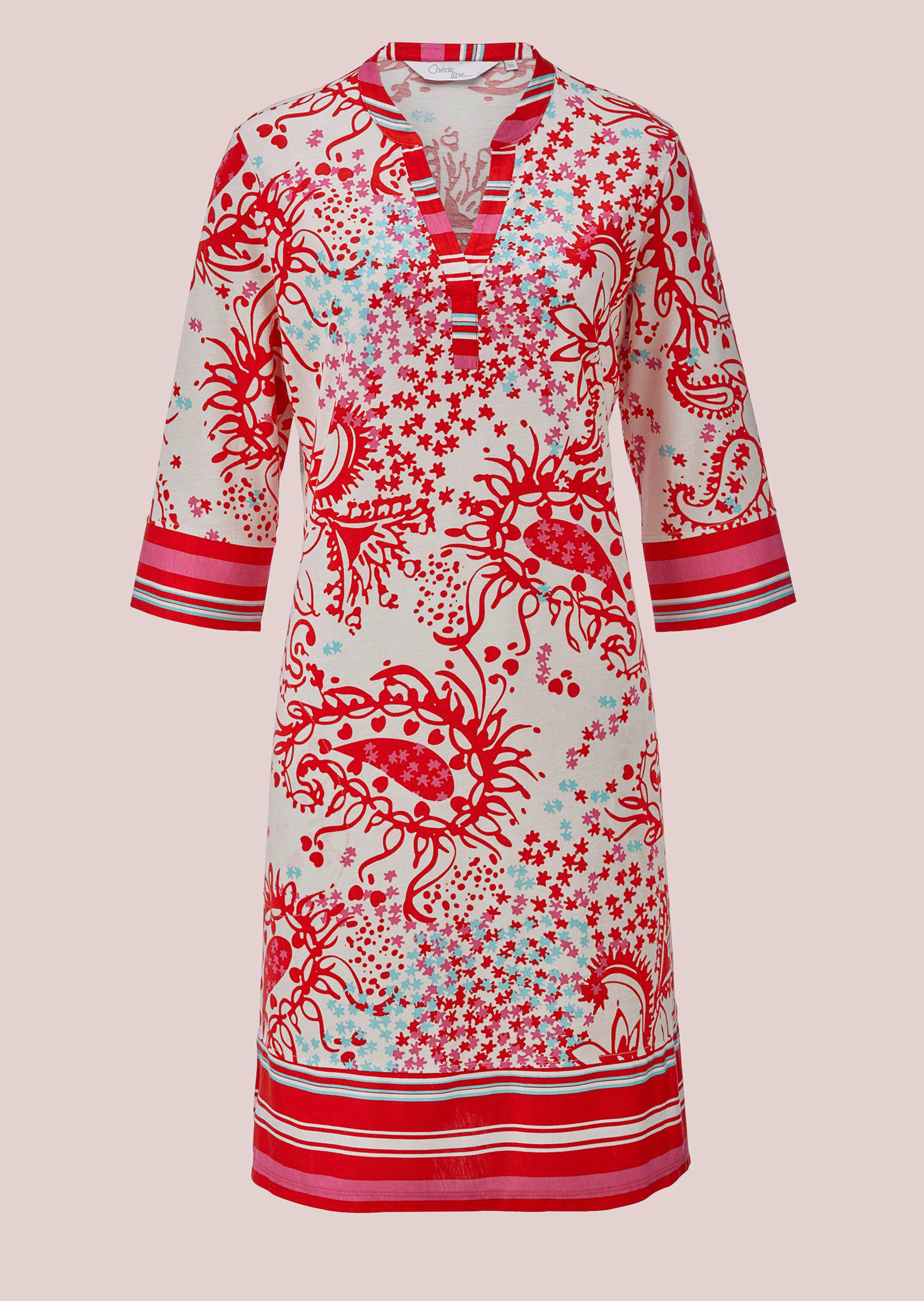 Nachthemd von CHÉRIE LINE – ein feminines Lieblingsstück in fantasievoller Paisley-Optik, die durch die fein gearbeitete Streifenbordüre am V-Ausschnitt und an den Säumen betont wird. Die kurze Knopfleiste am Ausschnitt setzt modische Akzente und unterstreicht den eleganten Stil. Dank weichem Baumwoll-Modal-Mix, praktischen Eingriffstaschen und seitlichen Schlitzen genießen Sie höchsten Komfort und uneingeschränkte Bewegungsfreiheit. Mit 3/4-langen Ärmeln.