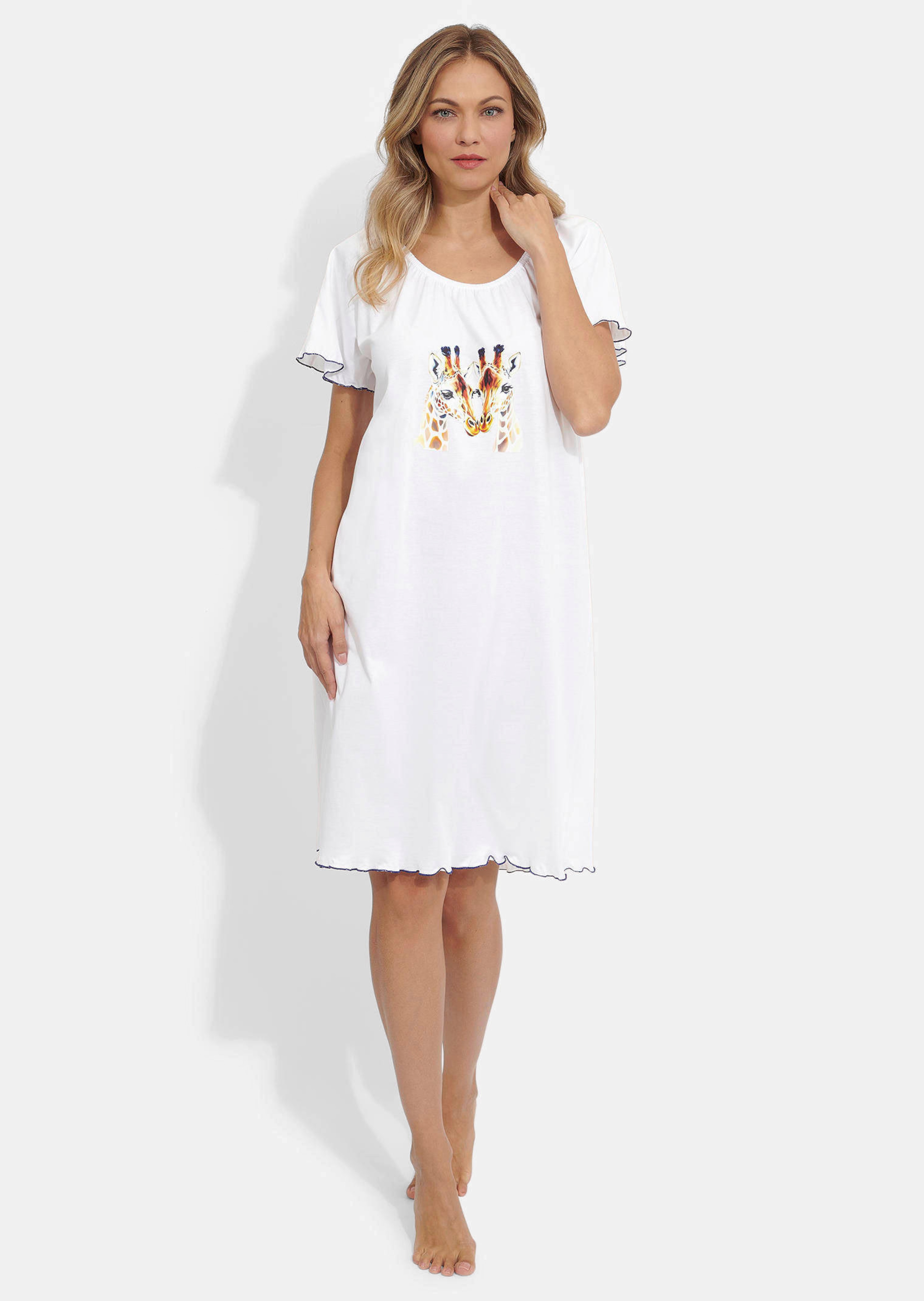 Nachthemden 2er-Pack aus reiner Baumwoll-Qualität, die soft und leicht auf der Haut liegt. Das Modell besticht durch eine legere Passform mit leicht geraffter Optik am Rundhalsausschnitt, einfach zum Hineinschlüpfen und angenehm zum Tragen. Kontrastfarbene Wellenkanten an den Raglenärmeln und am unteren Saum bringen Farbe ins Spiel. Mit je einem fantasievollen Motiv-Druck in exotischem Look.