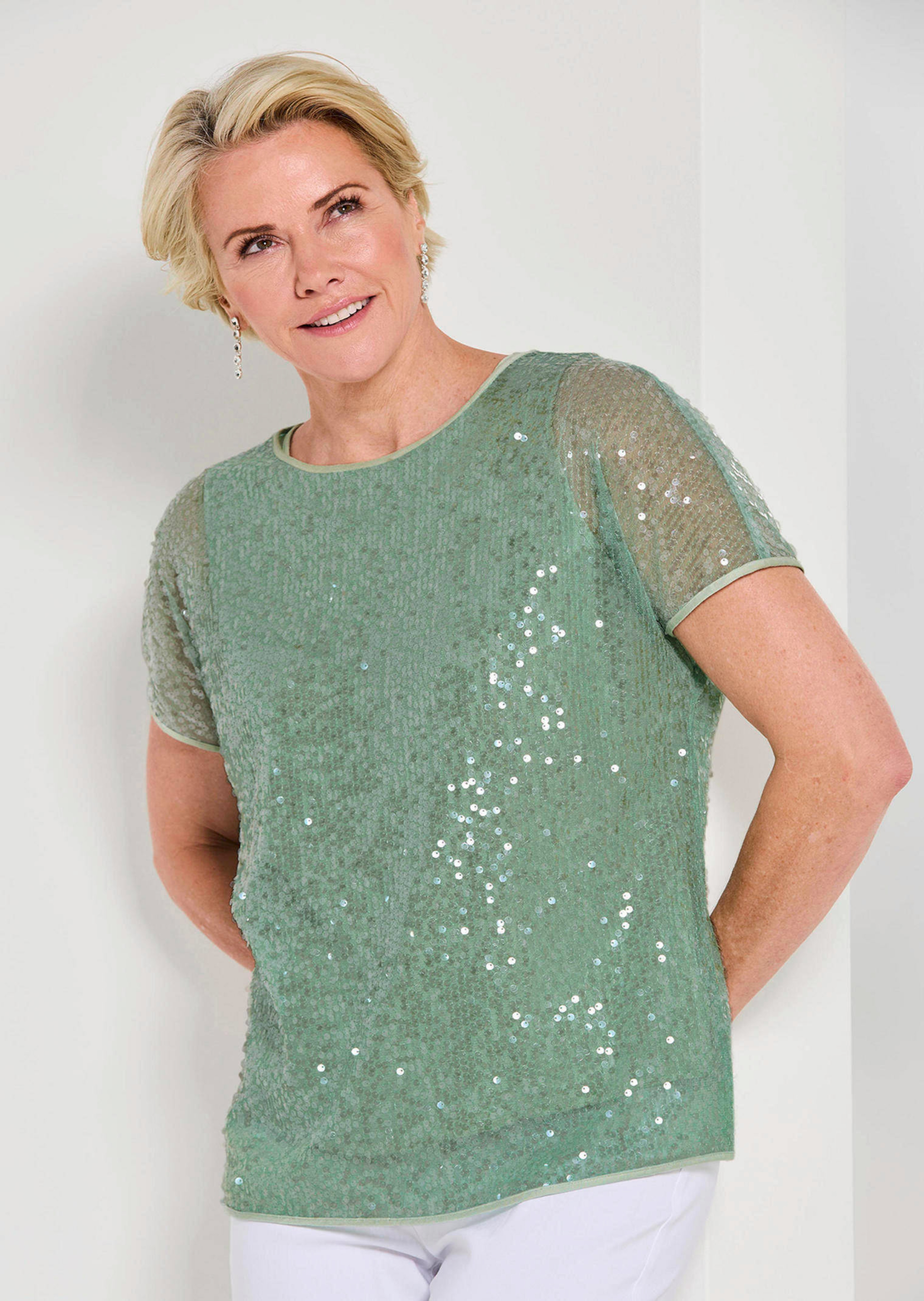 Schlupfbluse mit schimmernden Pailletten für einen funkelnden Auftritt. Der legere Schnitt mit U-Boot-Ausschnitt und überschnittenen Schultern schmeichelt der Silhouette, Satinbänder als Einfassung setzen edle Akzente. Ein farblich passendes Top aus weichem Viskose-Satin sorgt dafür, dass nichts durchscheint, und kann auch separat getragen werden. Länge ca. 69 cm in Gr. 46, ca. 65 cm in Gr. 23.