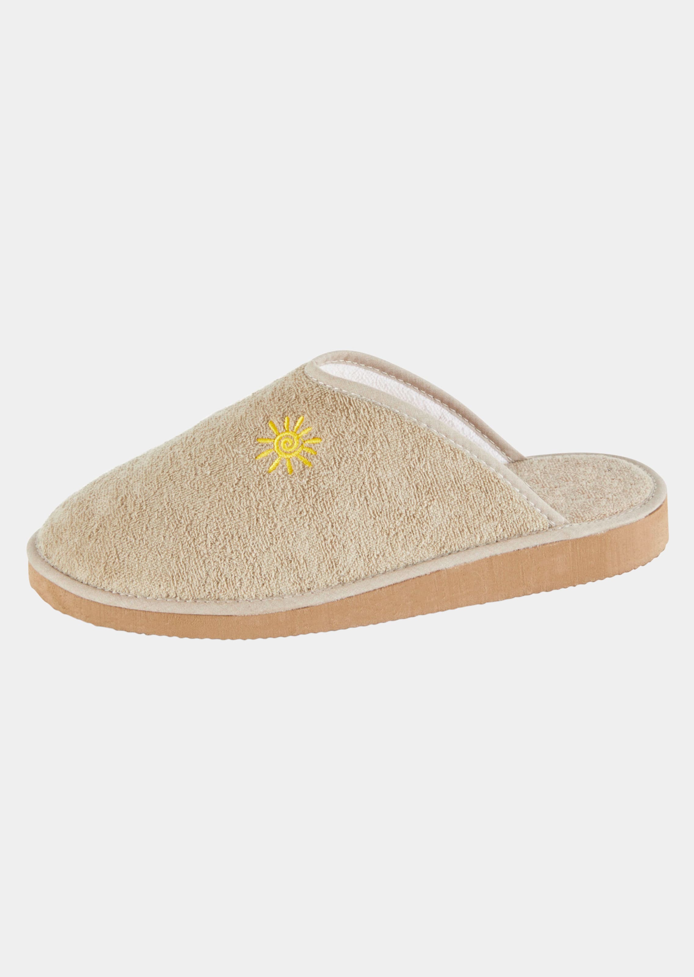 Pantoffel in G-Weite mit sommerlicher Stickerei – die kleine Sonne weckt die Lust auf warme Tage! Das Obermaterial und die Innenausstattung aus weicher Baumwolle sorgen für ein angenehmes Tragegefühl und besten Fußkomfort. Mit einer Laufsohle aus echtem Kautschuk. Dieses Modell ist perfekt für entspannte Stunden daheim oder auf der Terrasse!