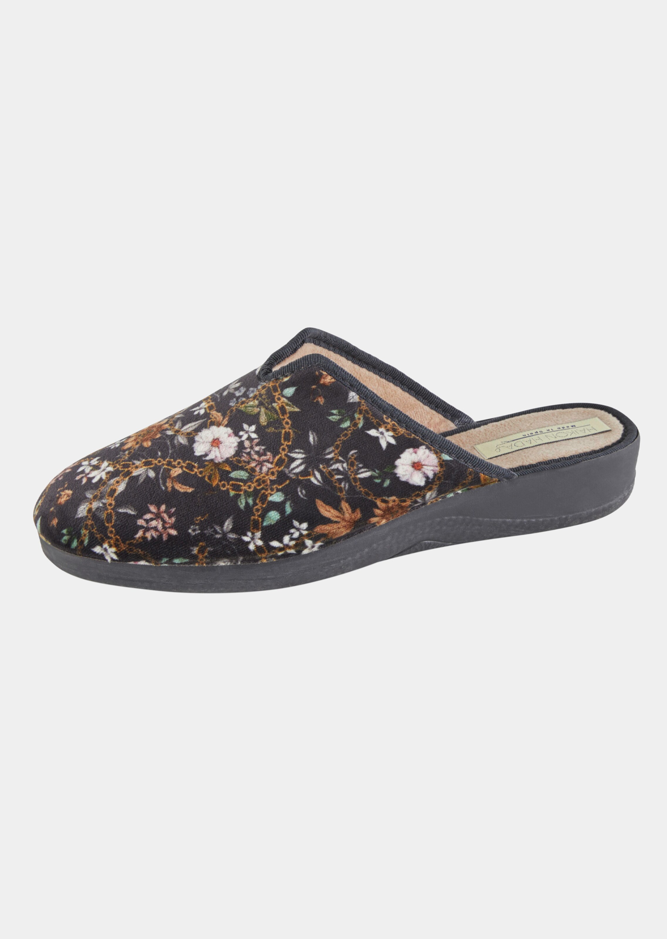 Pantoffel in F-Weite, der mit elegantem Blumenmotiv auf samtiger Oberfläche zum Blickfang wird. Die Laufsohle aus echtem Kautschuk sorgt für sicheren Halt, egal auf welchem Untergrund. Ideal für stilsichere Damen, die gemütliche Stunden zu Hause mit einer Prise Chic genießen wollen.