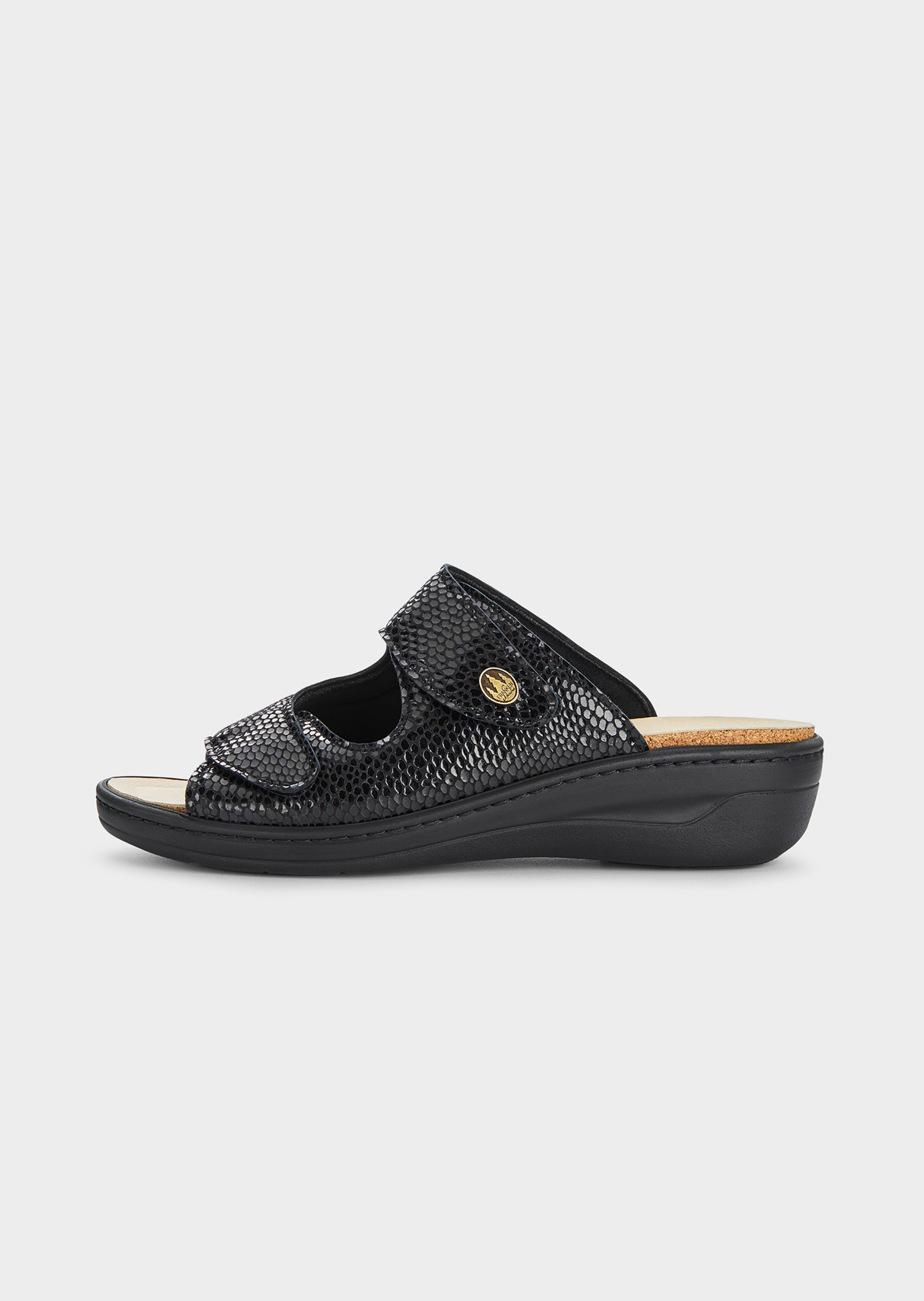 Pantoletten von FRANKEN-SCHUHE aus schickem Lackleder in Reptil-Optik. Ein hochwertiges Komfortmodell für druckempfindliche Füße, bei dem auch die Optik nicht zu kurz kommt. Bequem weit geschnitten, angenehm elastisch und mit Klettverschluss für guten Sitz. Durch das Wechselfußbett auch für lose Einlagen geeignet. Mit atmungsaktivem Mikrofaser-Futter, weicher Lederdecksohle und PU-Laufsohle.