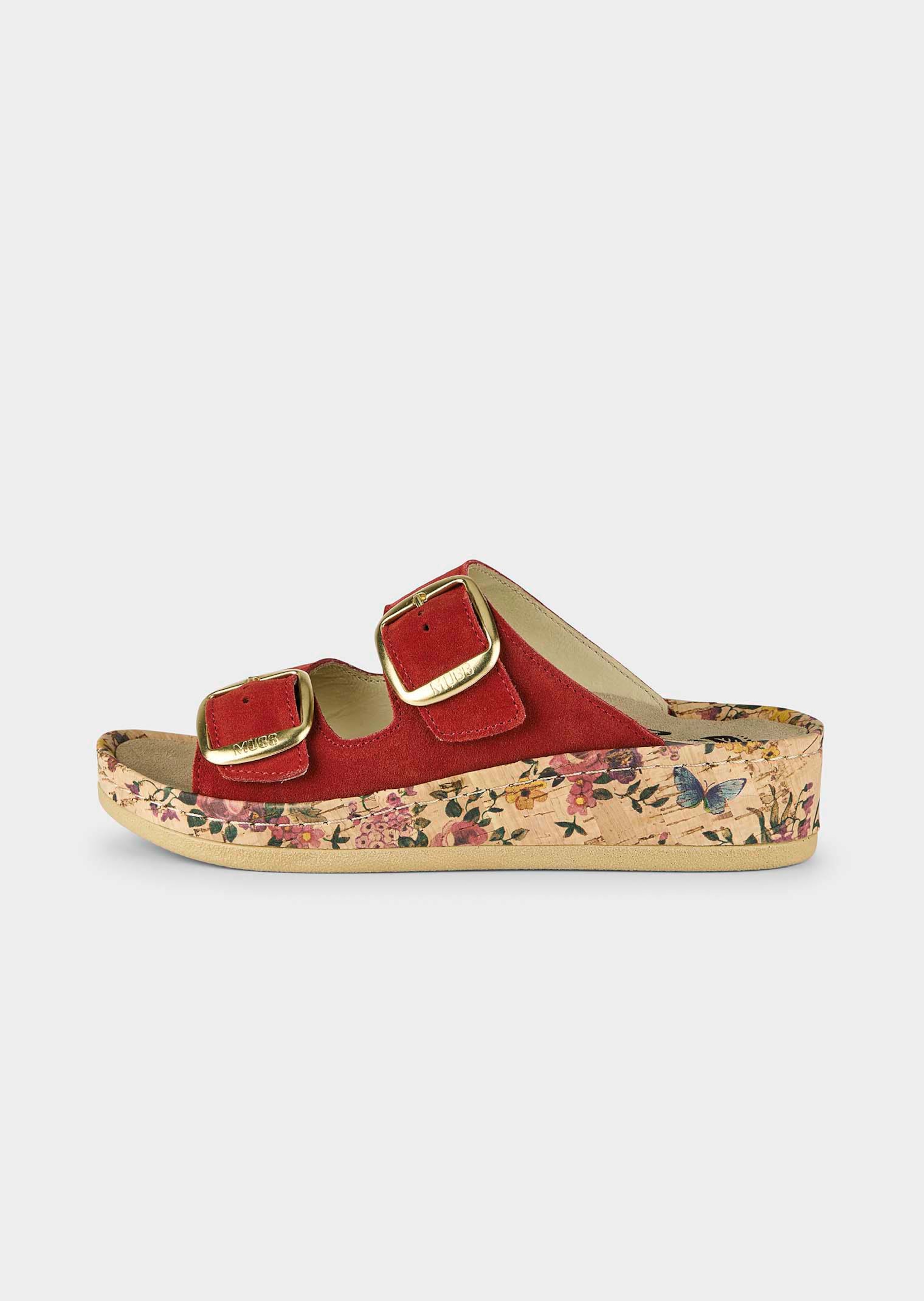 Pantoletten von MUBB in floralem Dessin. Blickfang ist der korkbezogene Keilabsatz, der mit attraktivem Blumenmuster einen Hauch Romantik verströmt. Für Komfort sorgen die breiten Riemen aus Leder, die mit dekorativen Schnallen in der Weite reguliert werden können. Auch Futter und Decksohle sind aus Leder gearbeitet. Mit austauschbarem Memory-Fußbett und rutschhemmender PU-Laufsohle.