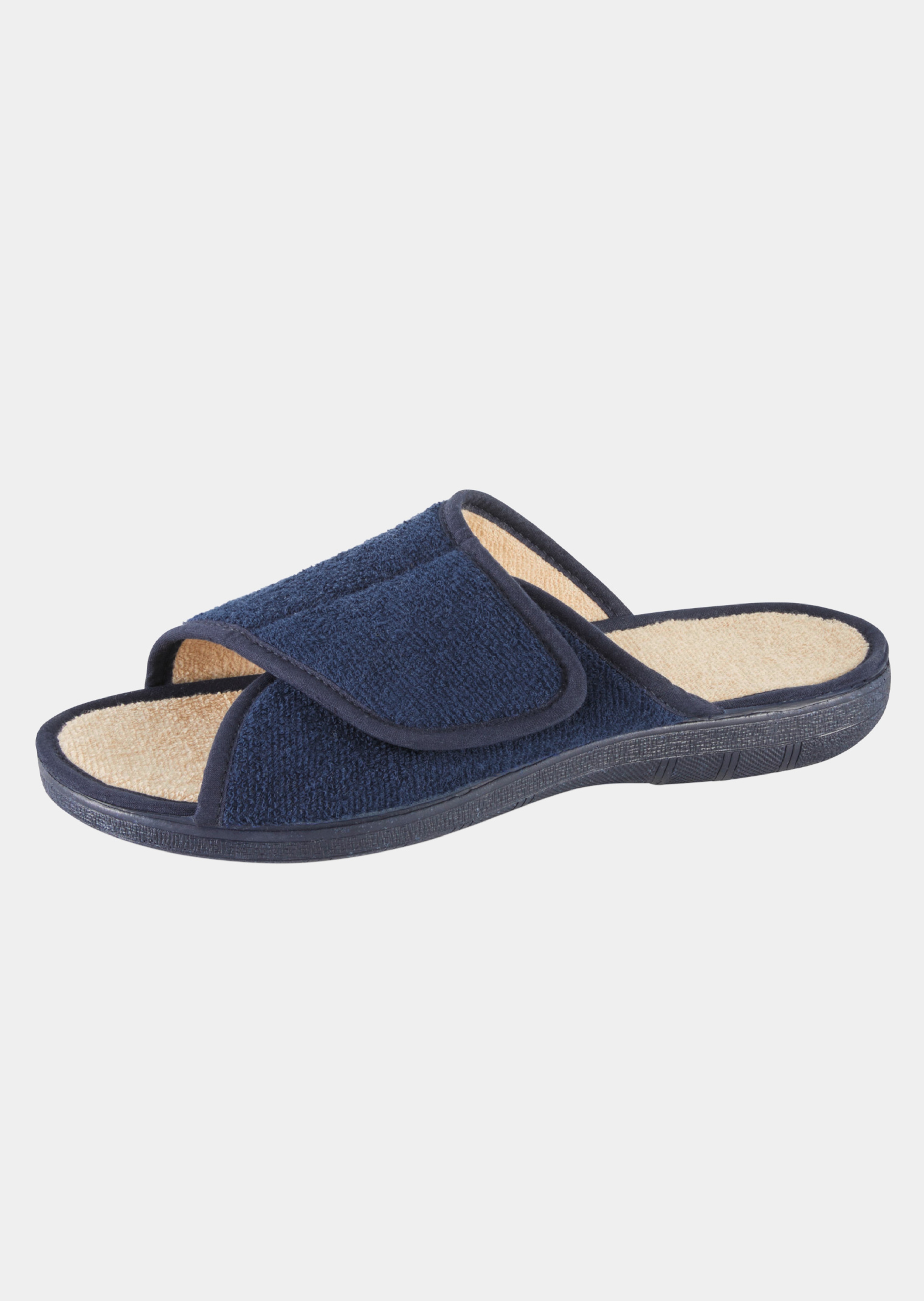 Pantoletten in offener Form mit breitem Klettverschluss, mit dem Sie die Passform optimal auf Ihren Fuß einstellen können. Für sicheren Halt sorgt zudem die Laufsohle aus echtem Kautschuk, so sind Sie allzeit sicher unterwegs. Obermaterial aus Textil.