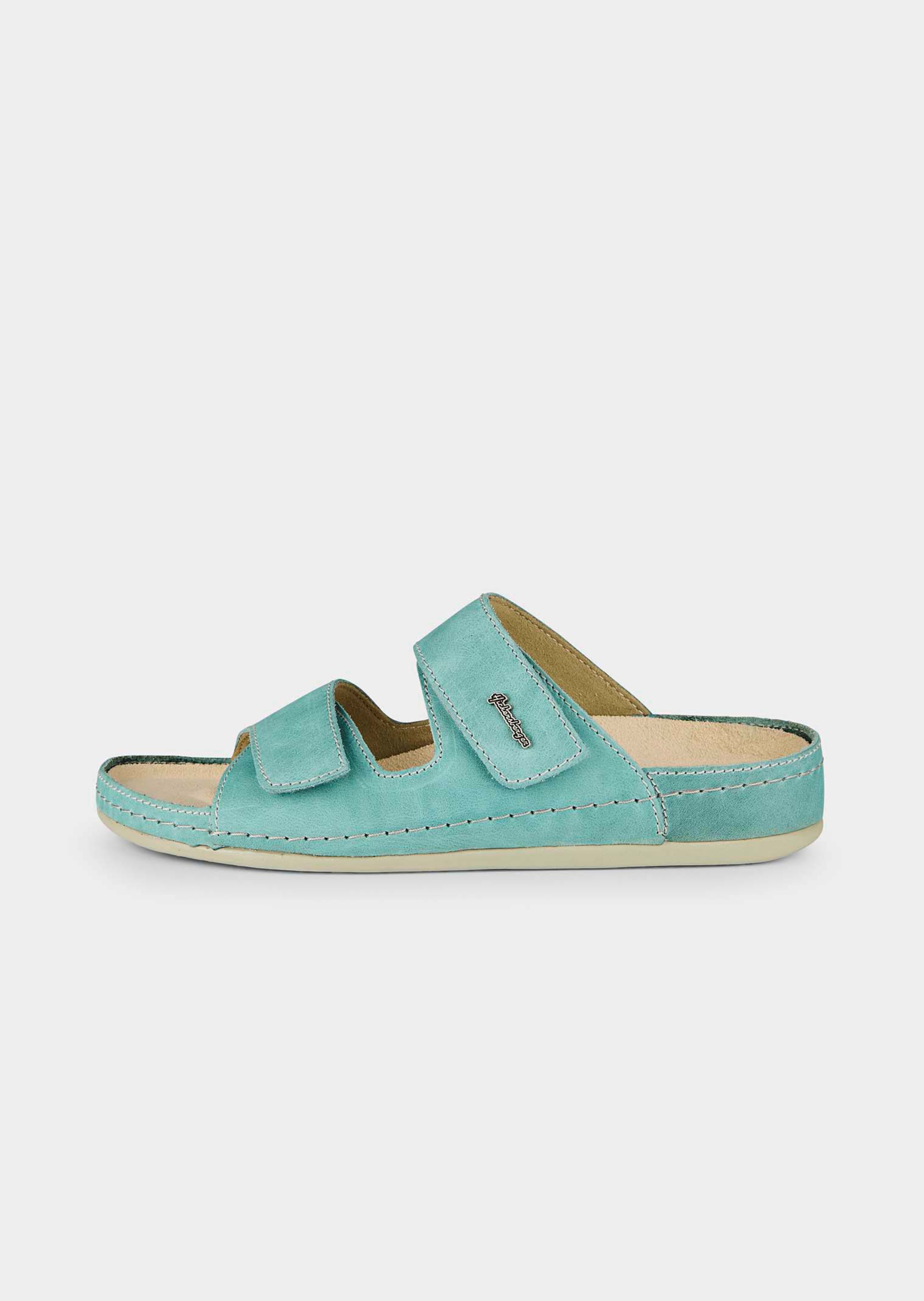 Pantoletten von HICKERSBERGER, die sich Ihren Füßen perfekt anpassen. Das anatomisch geformte Wechselfußbett ist mit chromfrei gegerbten Leder überzogen, mit ausgeprägter Kugelferse und flacher Schalensohle gearbeitet, bietet es viel Platz für orthopädische Einlagen. Auch die Laufsohle ist für Höhenkorrekturen geeignet. Praktisch mit Klettverschluss. Obermaterial und Decksohle aus Leder. Futter aus weicher Mikrofaser.