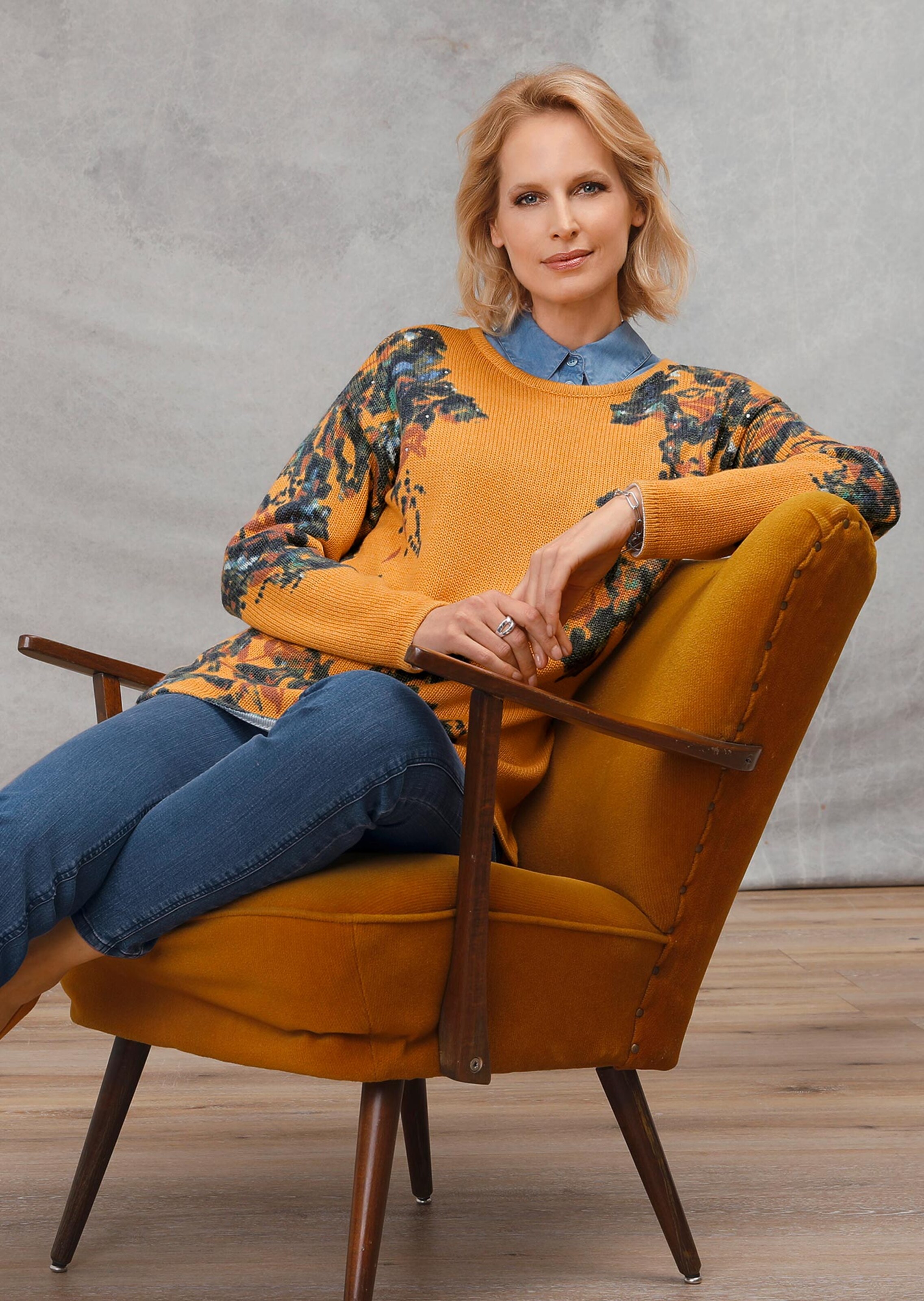 Pullover mit modernem, platziertem Floraldruck. Das hübsche Blättermuster sorgt für eine tolle Optik, die von rundum angebrachten Kristallsteinchen zusätzlich betont wird. Mit leicht überschnittener Schulter und Tubularabschlüssen. In einer trageangenehmen, pflegeleichten Garnmischung mit hohem Anteil an natürlicher Baumwolle. Länge ca. 67 cm in Gr. 46, ca. 63 cm in Gr. 23.