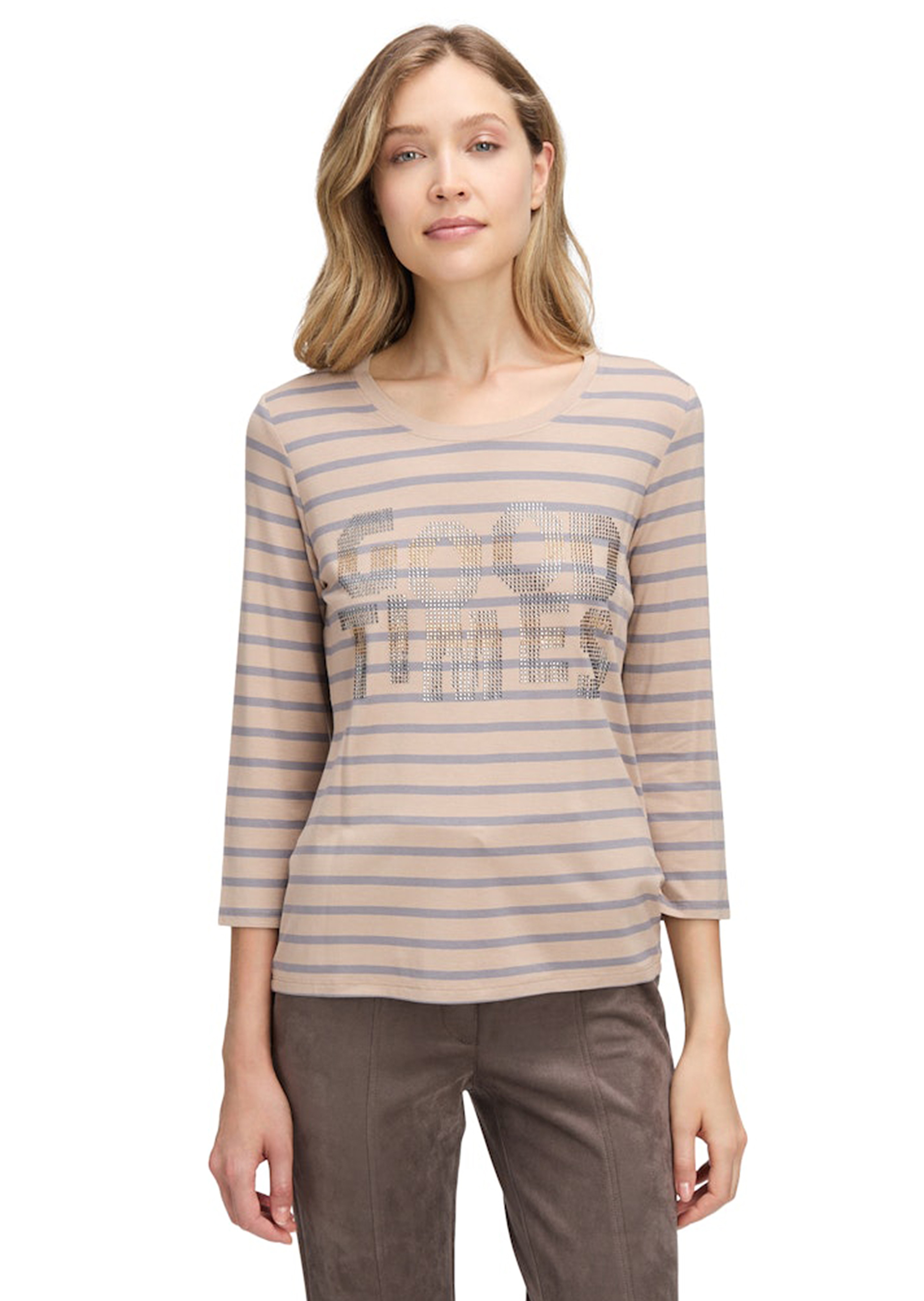 Ringelshirt von BETTY BARCLAY aus stretchbequemem Viskose-Jersey. Die farblich abgestimmten Streifen werden durch einen Schriftzug mit Glitzersteinchen aufgepeppt und verleihen dem sportlichen Shirt einen edlen Touch. Figurnahe Passform mit Rundhalsausschnitt und 3/4-Ärmeln. Die garngefärbte Qualität sorgt für langanhaltende Leuchtkraft. Länge ca. 68 cm in Gr. 46.