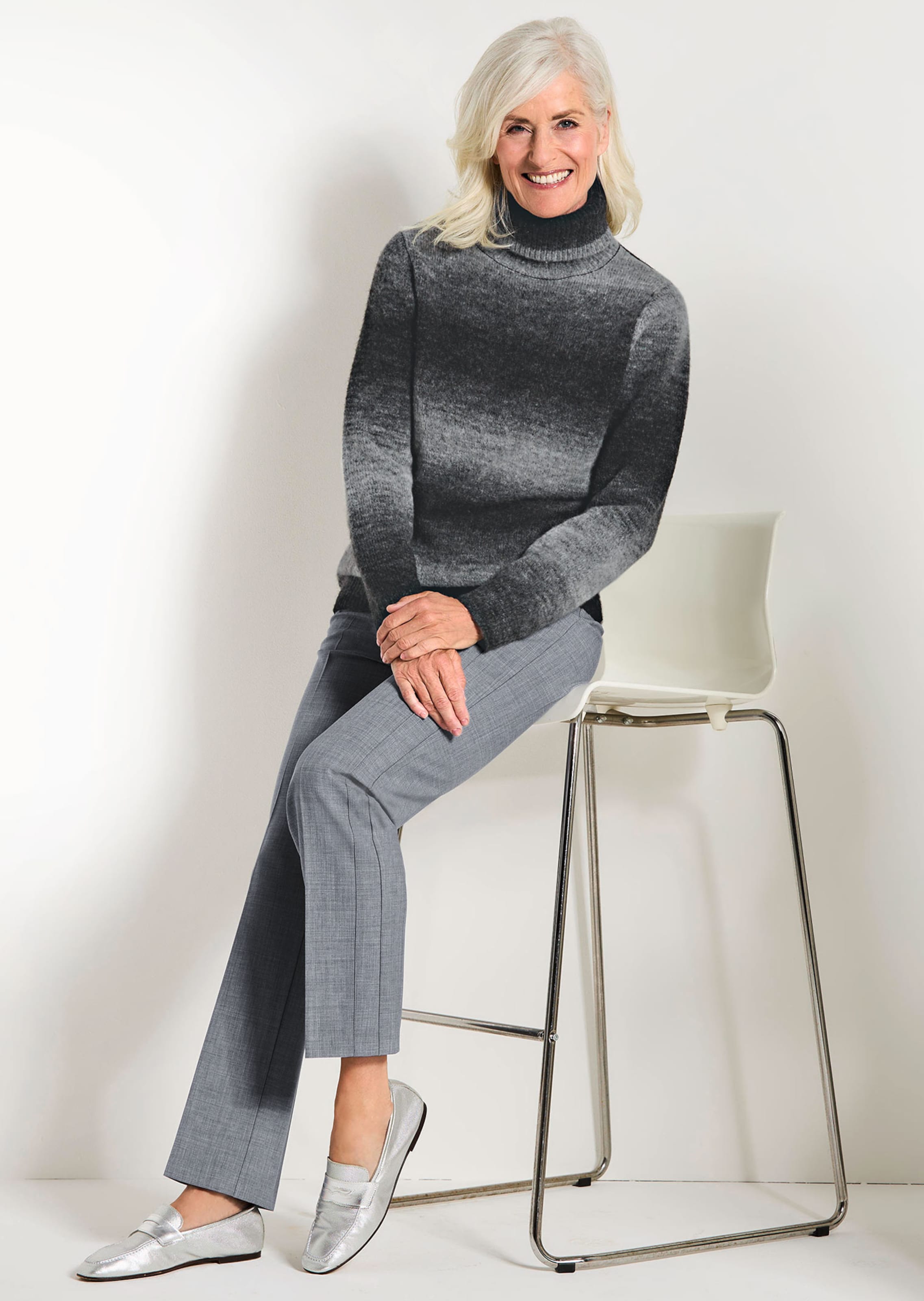 Pullover mit warmem Rollkragen in Rippenstrick, der sich weich anschmiegt und angenehm wärmt. Die softe Qualität mit Schurwolle schenkt Ihnen ein komfortables Tragegefühl an kalten Tagen. Mit langen Ärmeln und gerippten Säumen. Kombinationsfreudig zeigt sich das Streifenmuster im harmonischen Farbverlauf, so passt das Modell zu vielen Teilen in Ihrer Garderobe. Länge ca. 67 cm in Gr. 46, ca. 63 cm in Gr. 23.