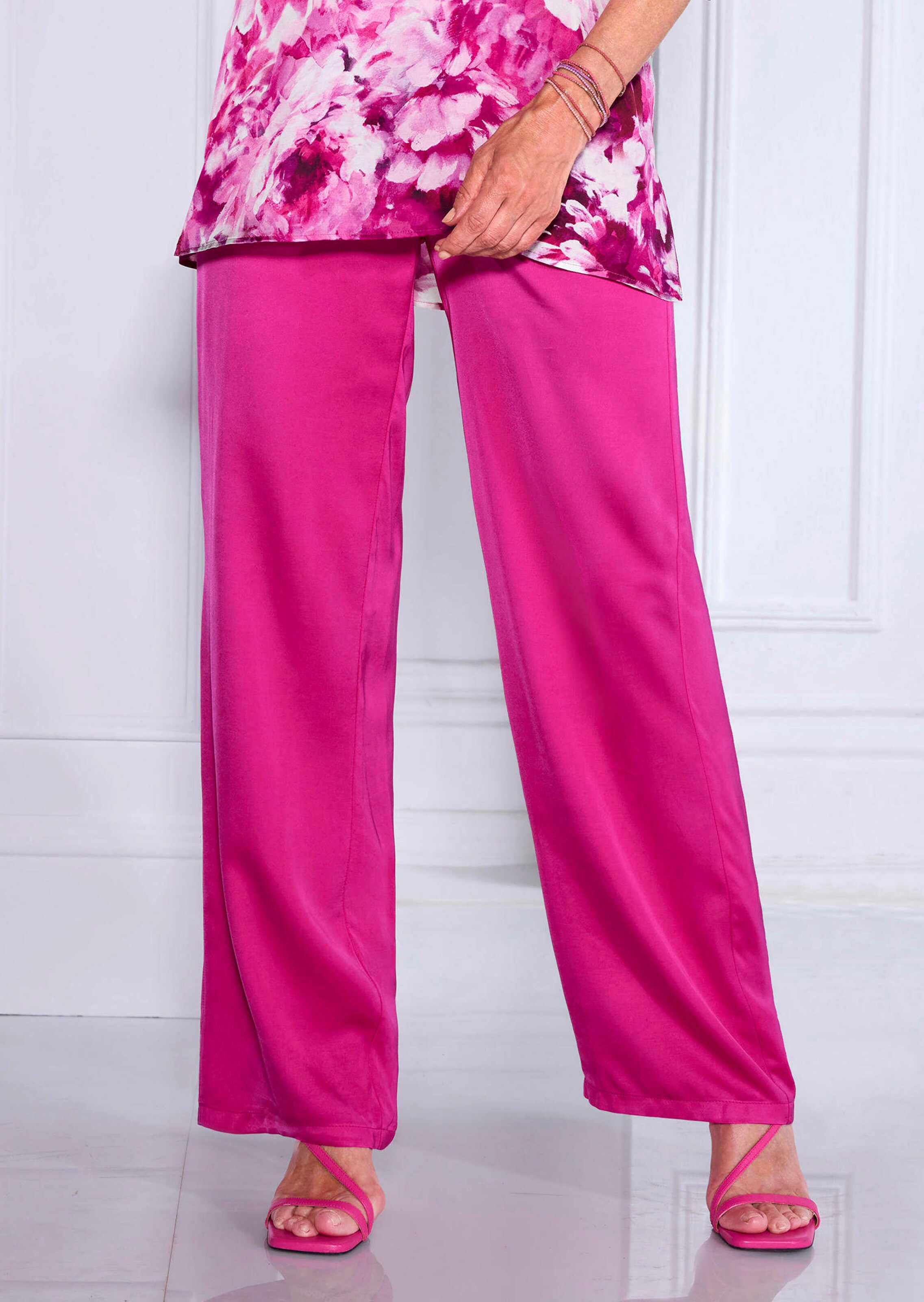Satinhose VERA mit raffinierter Bundlösung. Der Bundeinsatz vorne ist glatt und trägt nicht auf. Der Dehnbund im Rückteil sorgt für höchsten Tragekomfort. Das weite Bein umspielt raffiniert die Figur und engt nicht ein. Aus weich fließendem Viskose-Satin, das der Hose eine edel glänzende Optik verleiht. Seitliche Eingrifftaschen vervollständigen das Modell. Saumweite ca. 59 cm. Weiter Beinverlauf.