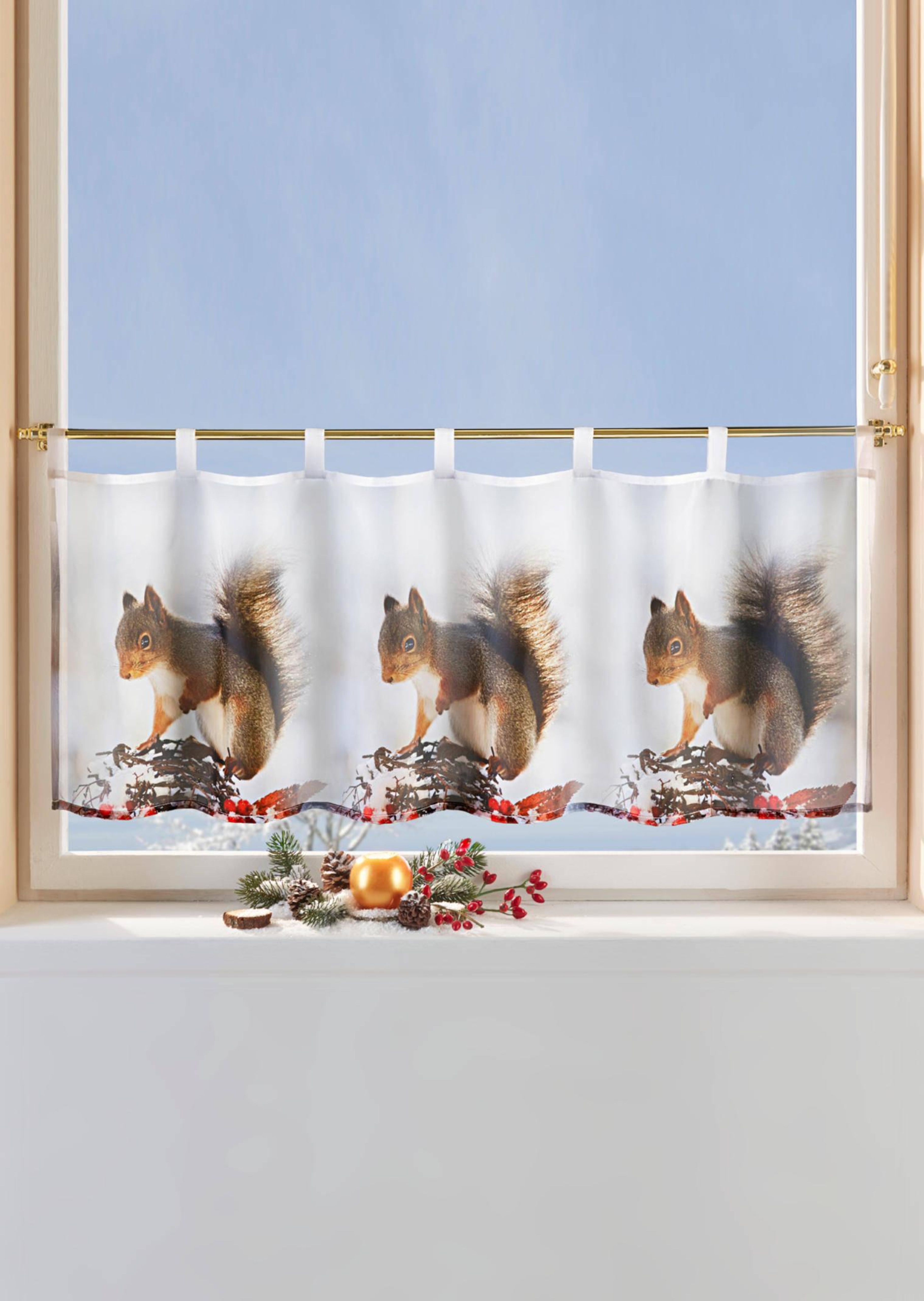 Scheibengardine mit außergewöhnlichem Motiv. Durch den digitalen Fotodruck kommen die putzigen Eichhörnchen plastisch und realitätsnah zur Geltung. Mit Schlaufen für Stangendurchzug gearbeitet zum einfachen Anbringen. Maßangabe jeweils Höhe x Breite.