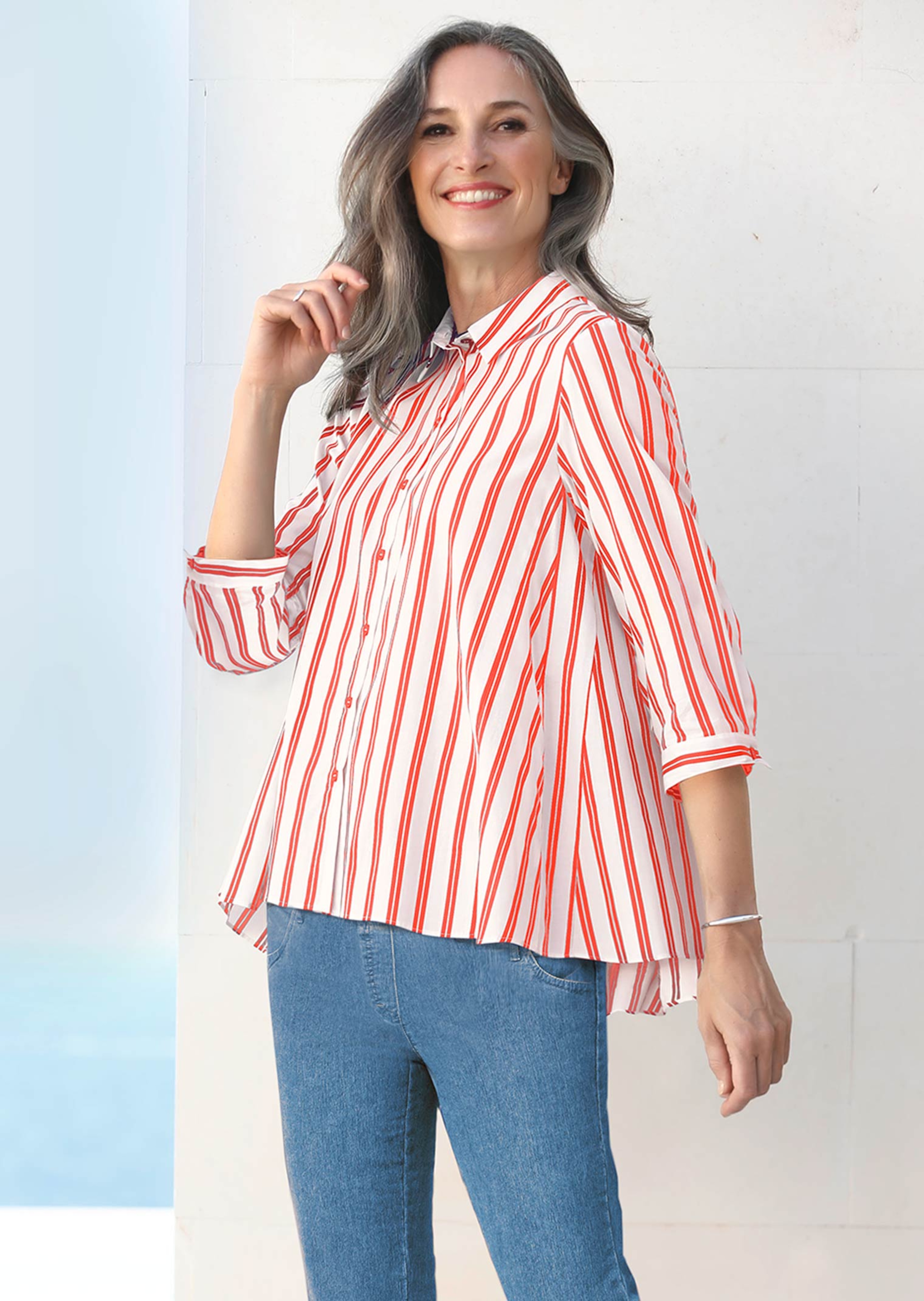 Bluse in modernem Stil mit durchgehender Knopfleiste. Die attraktive A-Linie mit hübscher Kellerfalte im Rückteil zaubert eine vorteilhafte Silhouette und bietet besonders viel Bewegungsfreiheit. Klassisch gearbeitet mit Hemdblusenkragen und 3/4-Ärmeln mit eleganter, breiter Manschette. Der sportive Doppelstreifen auf natürlicher Baumwoll-Stretch-Qualität wird Sie begeistern. Länge ca. 76 cm in Gr. 46, ca. 72 cm in Gr. 23.