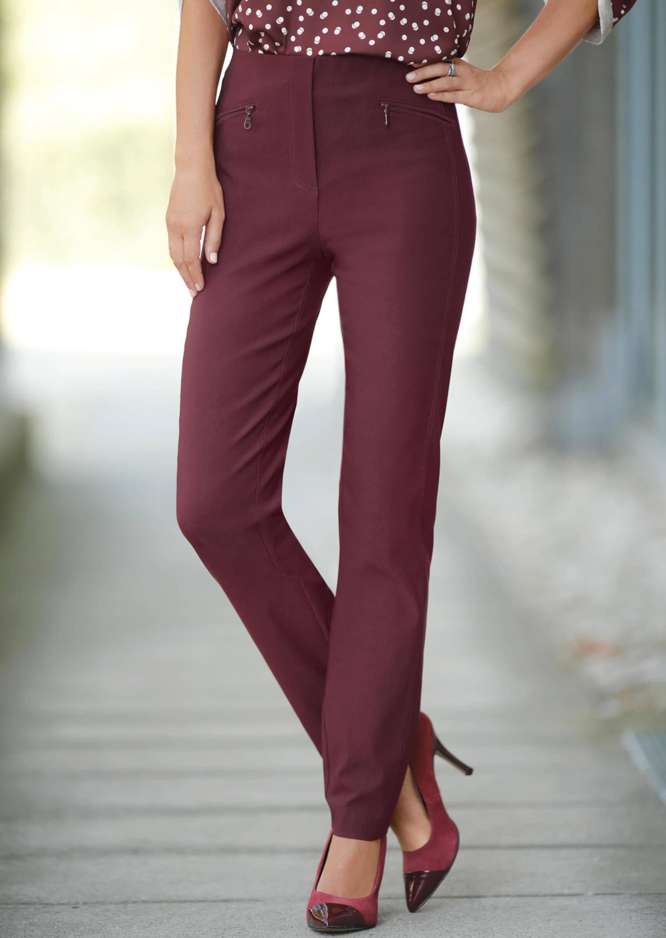 Bengalinhose LOUISA mit bequemem Schlupfbund. Die Hose trägt sich rundum angenehm dank des elastischen Materials mit angerauter Innenseite. Schmaler Schnitt mit Längsteilungsnähten im Vorder- und Rückteil für eine schlanke Silhouette und flache Bauchpartie. Mit optischem Reißverschluss und Taschen mit Reißverschlüssen. Saumweite ca. 36 cm. Schmaler Beinverlauf.