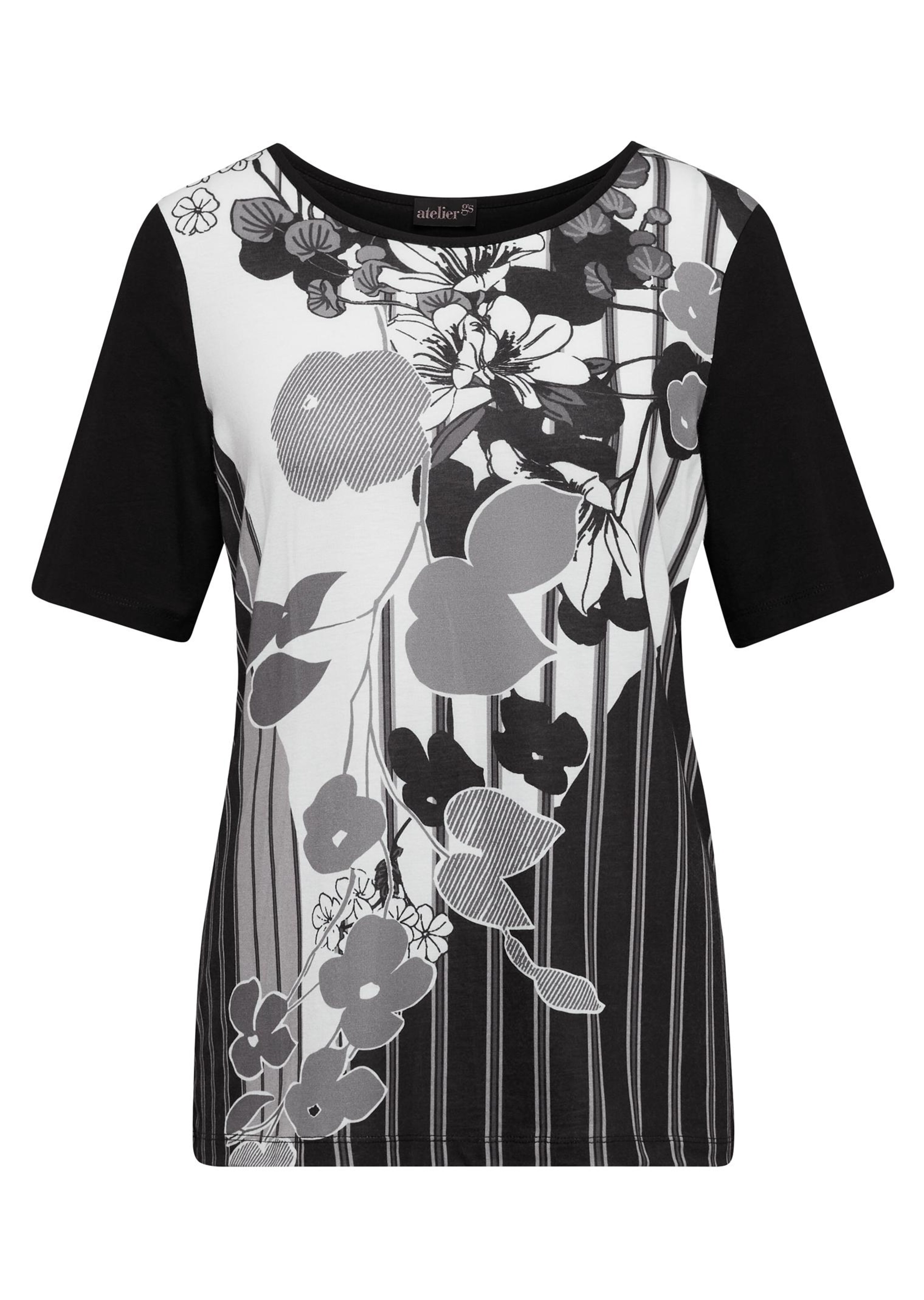 Shirt mit platziertem Druck auf der Vorderseite, der sportive Blüten- und Streifenelemente offenbart. Die Rückseite sowie die halblangen Ärmel sind uni gehalten. Aus einer wunderbar weichen und elastischen Jerseyqualität – hautsympathisch und pflegeleicht. Abgerundet mit bequemem U-Boot-Ausschnitt. Länge ca. 64 cm in Gr. 46, ca. 60 cm in Gr. 23.
