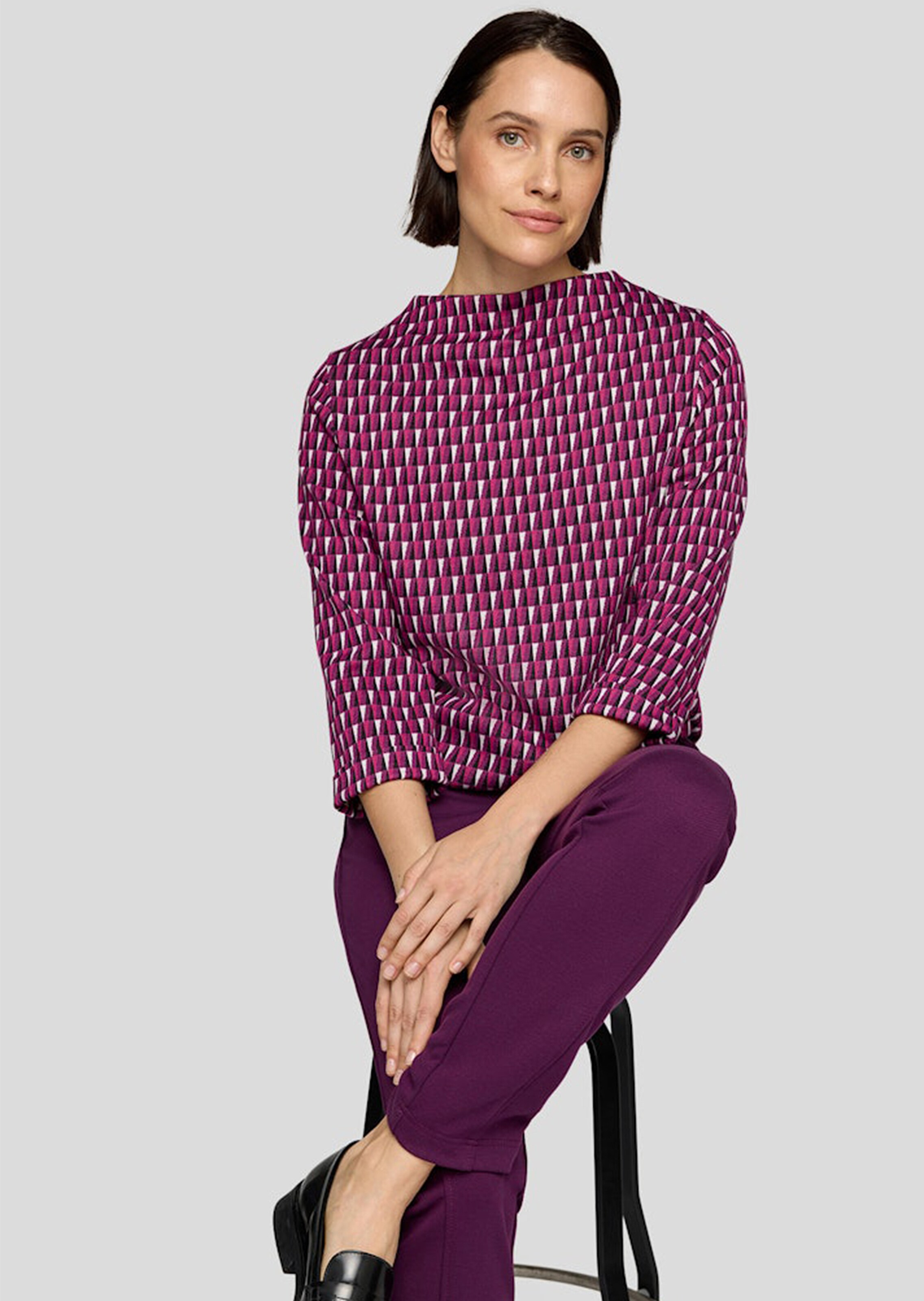 Jacquardshirt von RABE in hochwertiger, dichter Jersey-Qualität – ein echtes Wohlfühlmodell für kalte Tage. Das grafische Minimaldessin in harmonischen Beerentönen sorgt für feminine Raffinesse und lässt sich prima kombinieren. Mit angedeutetem Stehkragen, umgeschlagenem 3/4-Ärmel und kleinen Seitenschlitzen. Länge ca. 64 cm in Gr. 46.
