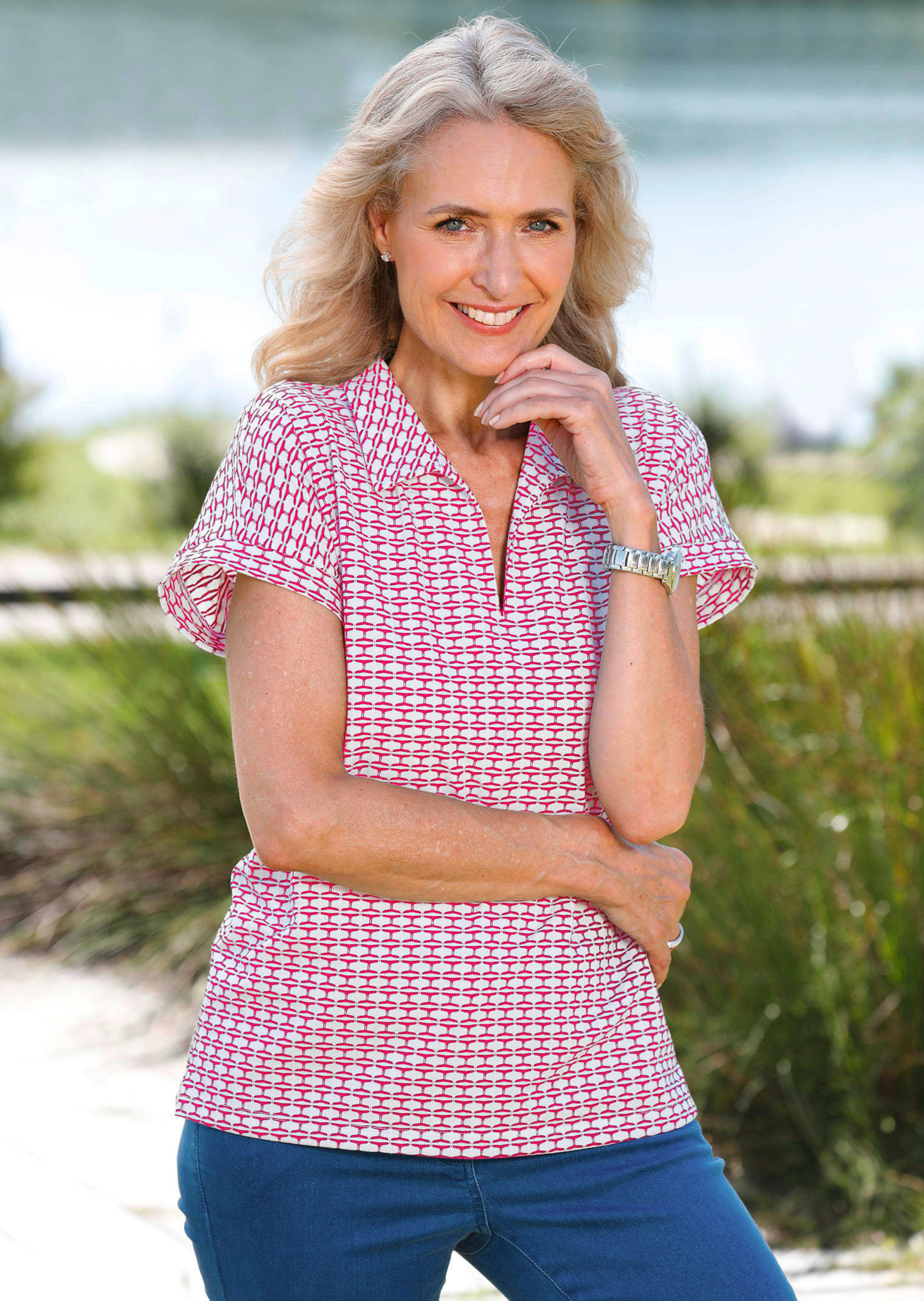 Shirt mit V-Ausschnitt und Polokragen, überschnittener Schulter und schmaler Blende am Armloch. Die gerade Passform, Seitennahtschlitze und hüftlange Form verleihen eine moderne Silhouette. Hoher Tragekomfort durch stretchbequeme Jerseyqualität mit Viskose. Leicht strukturierte Oberfläche durch ein kontrastfarbiges, aber dezentes Jacquardmuster. Länge ca. 64 cm in Gr. 46, ca. 60 cm in Gr. 23.