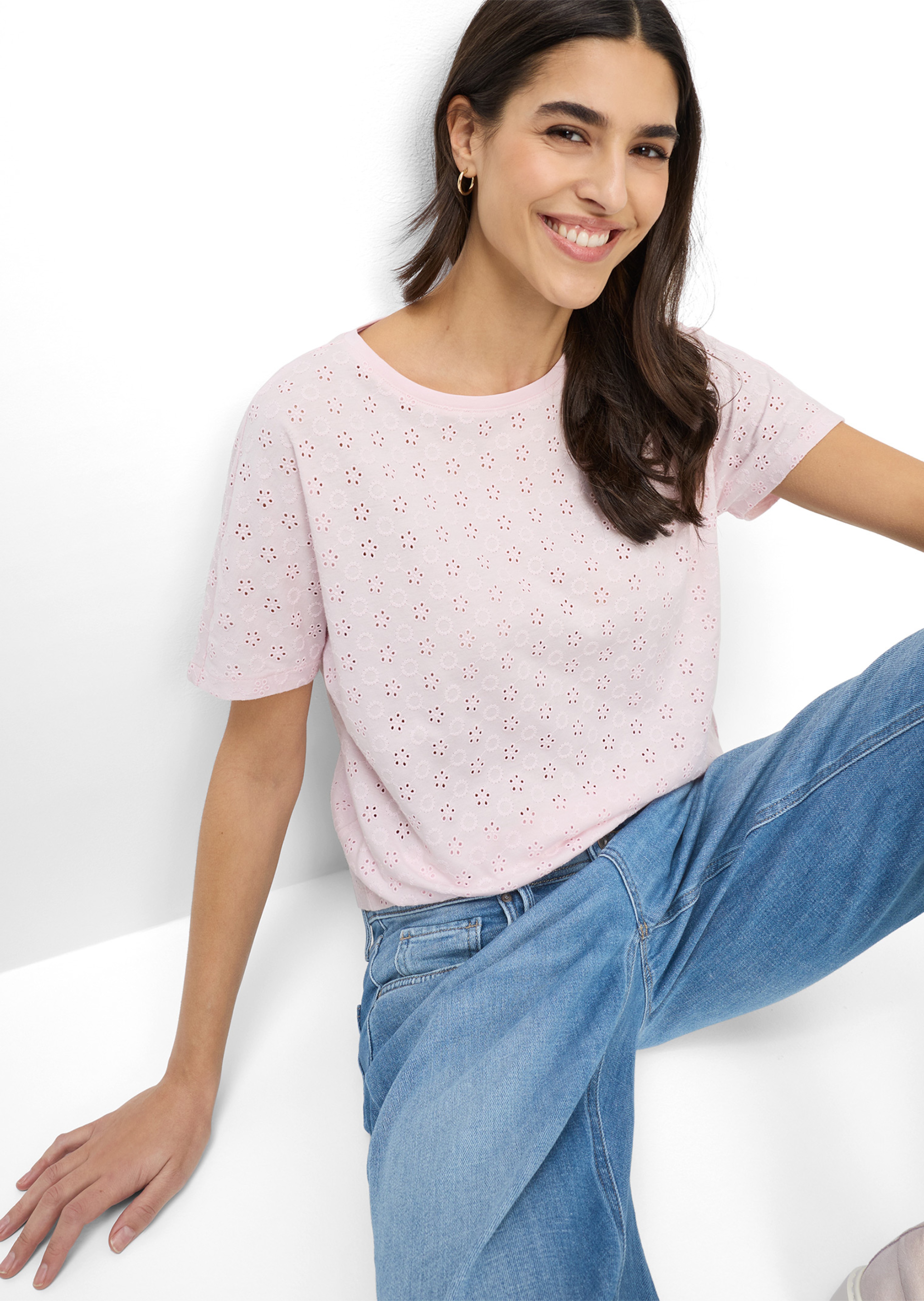 Shirt von BRAX mit filigraner Blüten-Lochstickerei, die dem Modell eine leichte, sommerliche Note verleiht. Die reine Baumwolle fühlt sich weich auf der Haut an und begleitet angenehm durch warme Tage. Der Rundhalsausschnitt ist mit einer glatten Jerseyblende gearbeitet und liegt komfortabel an. Für noch mehr Luftigkeit sorgen die angeschnittenen, kurzen Ärmel. Ein feminines Shirt, das sich unkompliziert kombinieren lässt – zu Jeans, Röcken oder eleganten Hosen. Länge ca. 64 cm in Gr. 46.