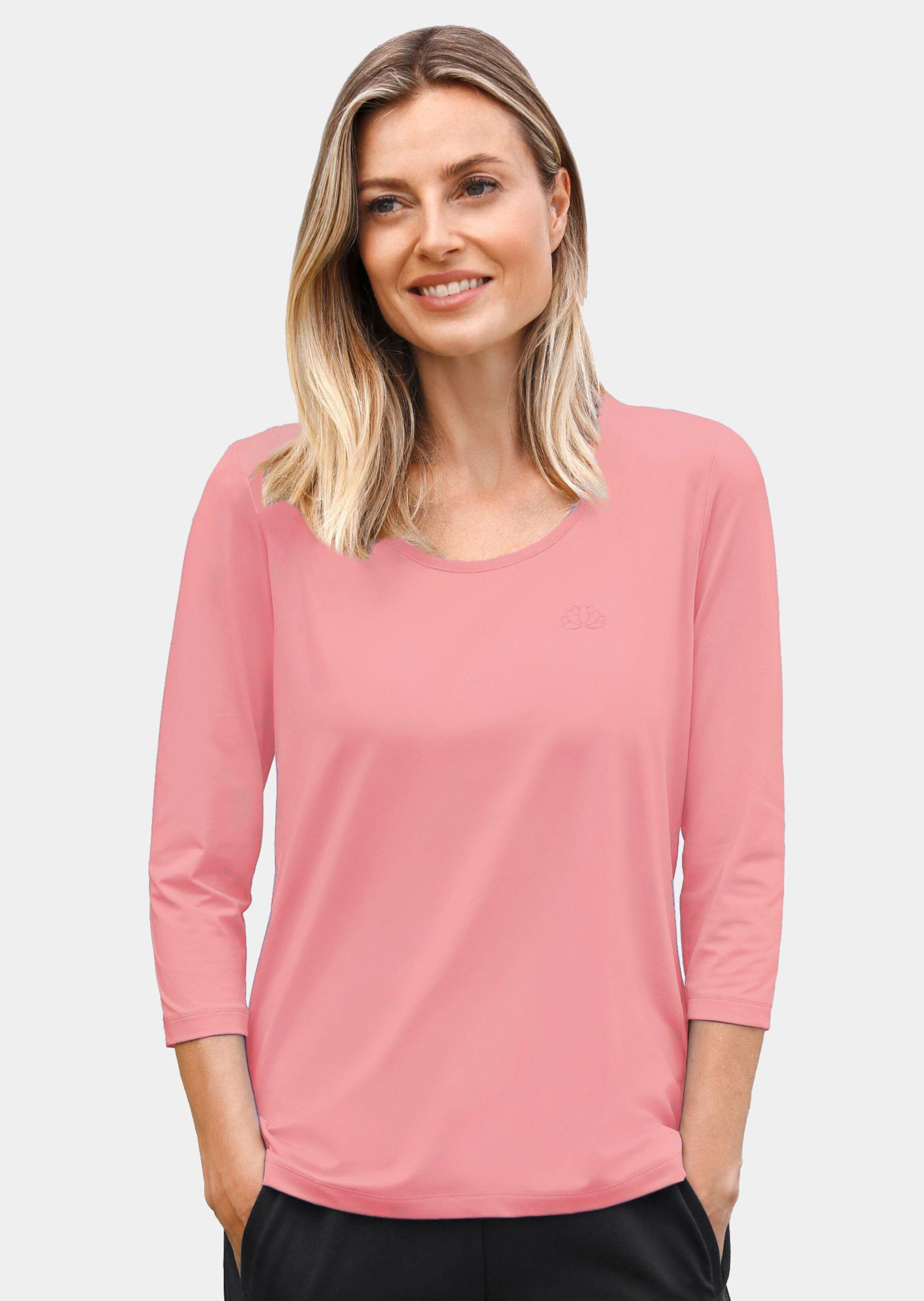 Shirt mit ovalem Rundhalsausschnitt und 3/4-Ärmeln. Ein echtes Kombitalent mit kleiner Lotusblüten-Stickerei vorne. Herrlich pflegeleicht, da schnell trocknend und bügelarm – einfach waschen, trocknen und anziehen. Die leichte, fließende Qualität trägt sich sehr angenehm, Elasthan macht sie formstabil. Ideal für Sport und Freizeit. Länge ca. 66 cm in Gr. 46, ca. 62 cm in Gr. 23.