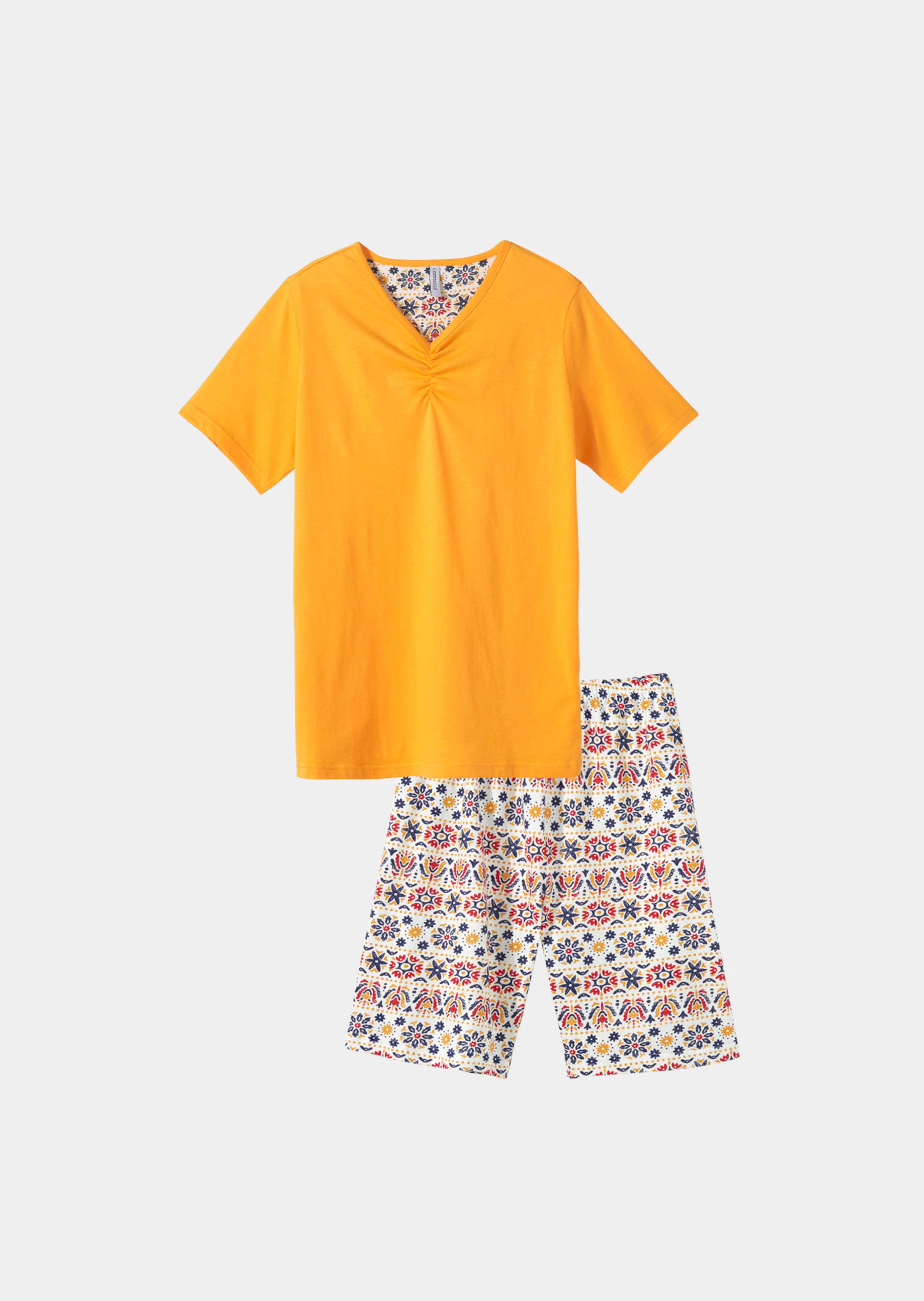 Shorty-Set von COMTESSA – Ihr Schlafbegleiter für warme Nächte: Halbarmshirt mit V-Ausschnitt und gemusterter Innenverarbeitung und kurze Hose im Alloverdruck. Beides in legerer Passform aus weichem Single-Jersey – die reine Baumwollqualität sorgt für ein natürliches Tragegefühl und entspannte Nächte.