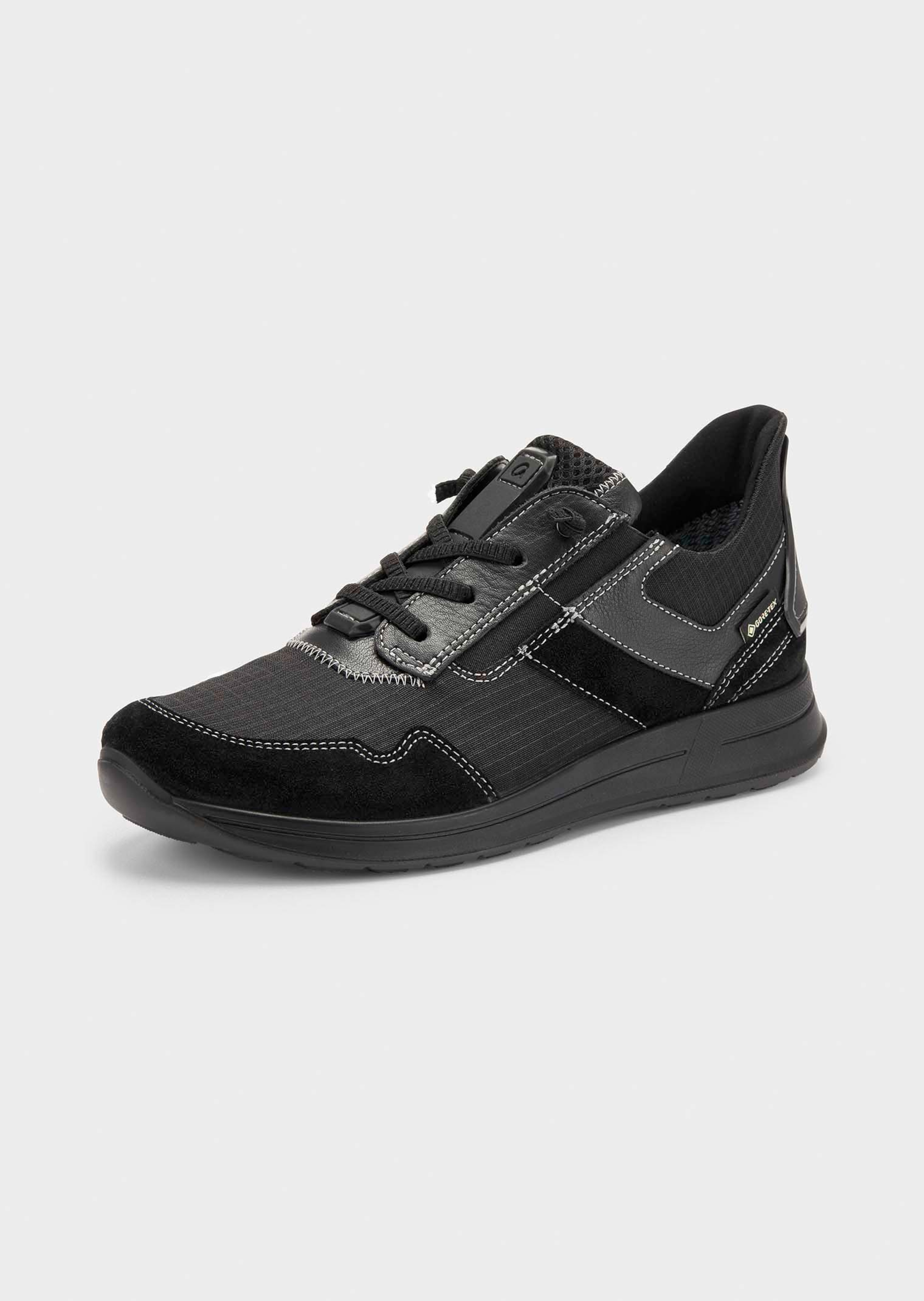 Sneaker von ARA zum Schnüren. Wind- und wasserdicht dank GORE-TEX®. Aus Leder und Textil mit Textilfutter. Wechselfußbett mit Frottee auf Bambusbasis bezogen. Dämpfende High-Soft-Ausstattung. Flexible PU/TPU-Laufsohle.