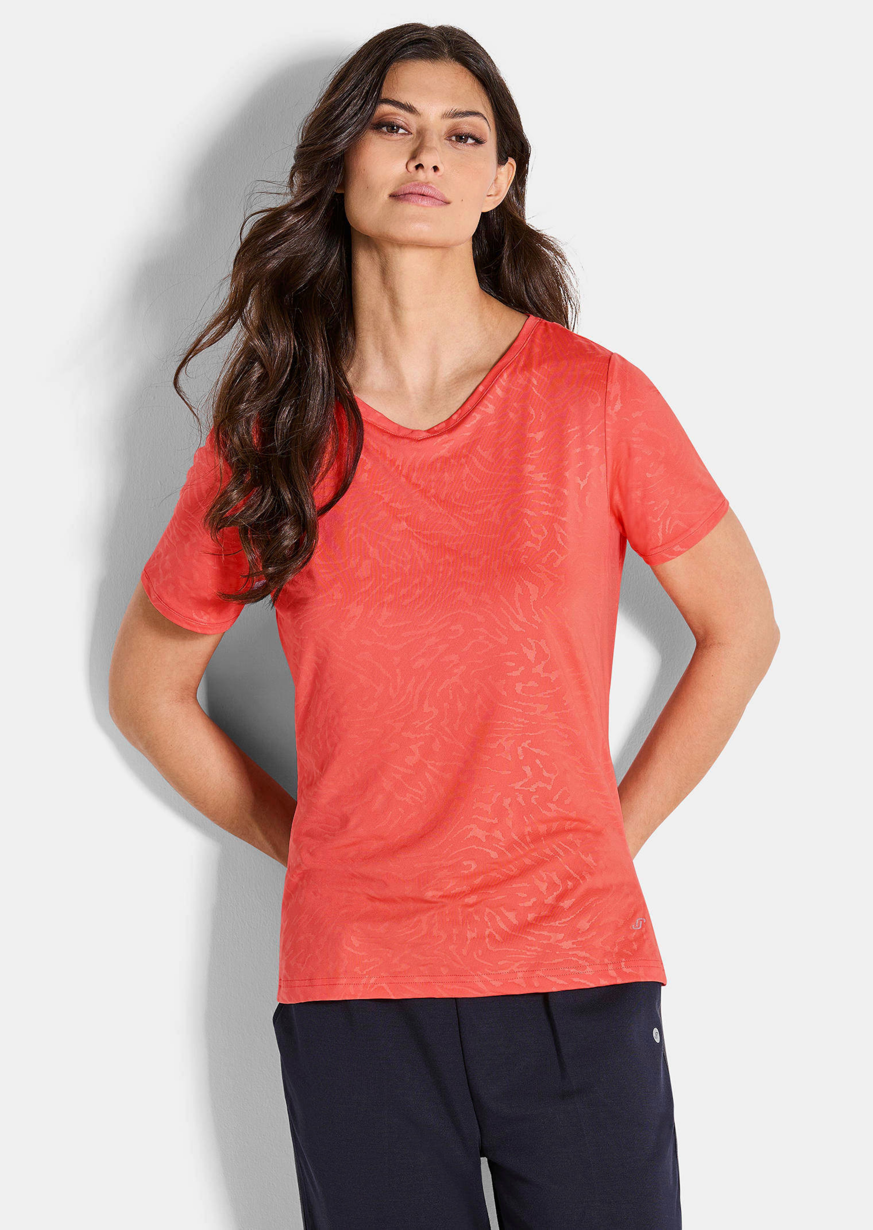 T-Shirt von JOY aus recyceltem Polyester mit Elasthan. Das Material ist atmungsaktiv und anschmiegsam – perfekt für Sport und Freizeit. Die Jacquardmusterung und der silberfarbene Logo-Print am Saum sorgen für femininen Chic. In figurumspielender Passform mit schmalen, seitlichen Einsätzen, abgerundetem V-Ausschnitt und Halbarm. Länge ca. 63 cm in Gr. 46.
