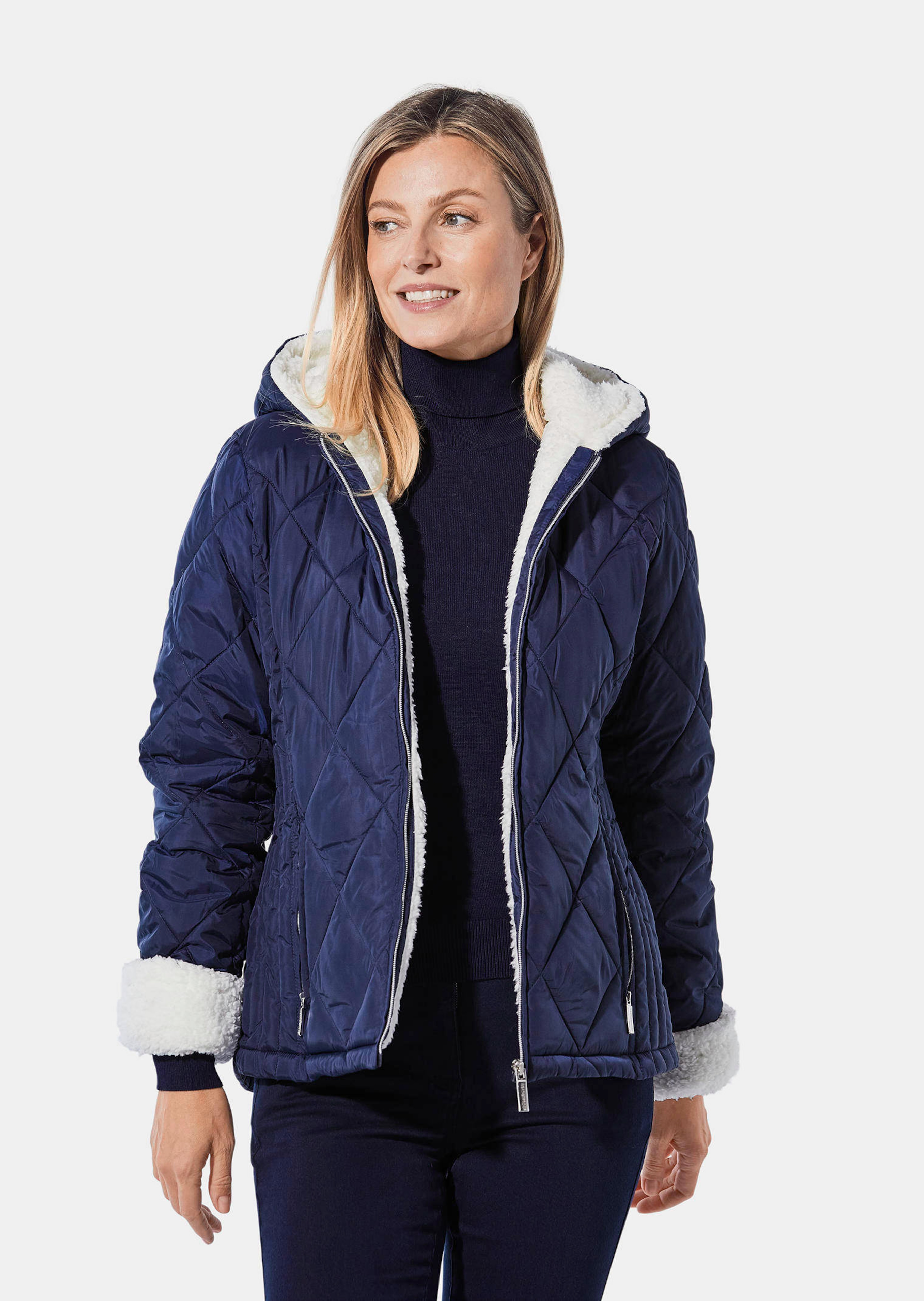 Steppjacke mit kuscheligem Teddy-Innenfutter. Der Teddy-Plüsch findet sich auch am Ärmelaufschlag und der angesetzten Kapuze wieder. Die Jacke im Rautenstepp ist mit Wiener Nähten auf Figur gebracht, auch die Längssteppung an den Seiten betont die schlanke Linie. Praktische Reißverschlüsse verschließen die Jacke und die seitlichen Eingrifftaschen. Ein verspielt-sportliches Modell für die kühle Jahreszeit, die zum Kuscheln einlädt. Dieses Modell fällt eine Nummer kleiner aus. Bitte bestellen Sie die Jacke eine Nummer größer als gewohnt.