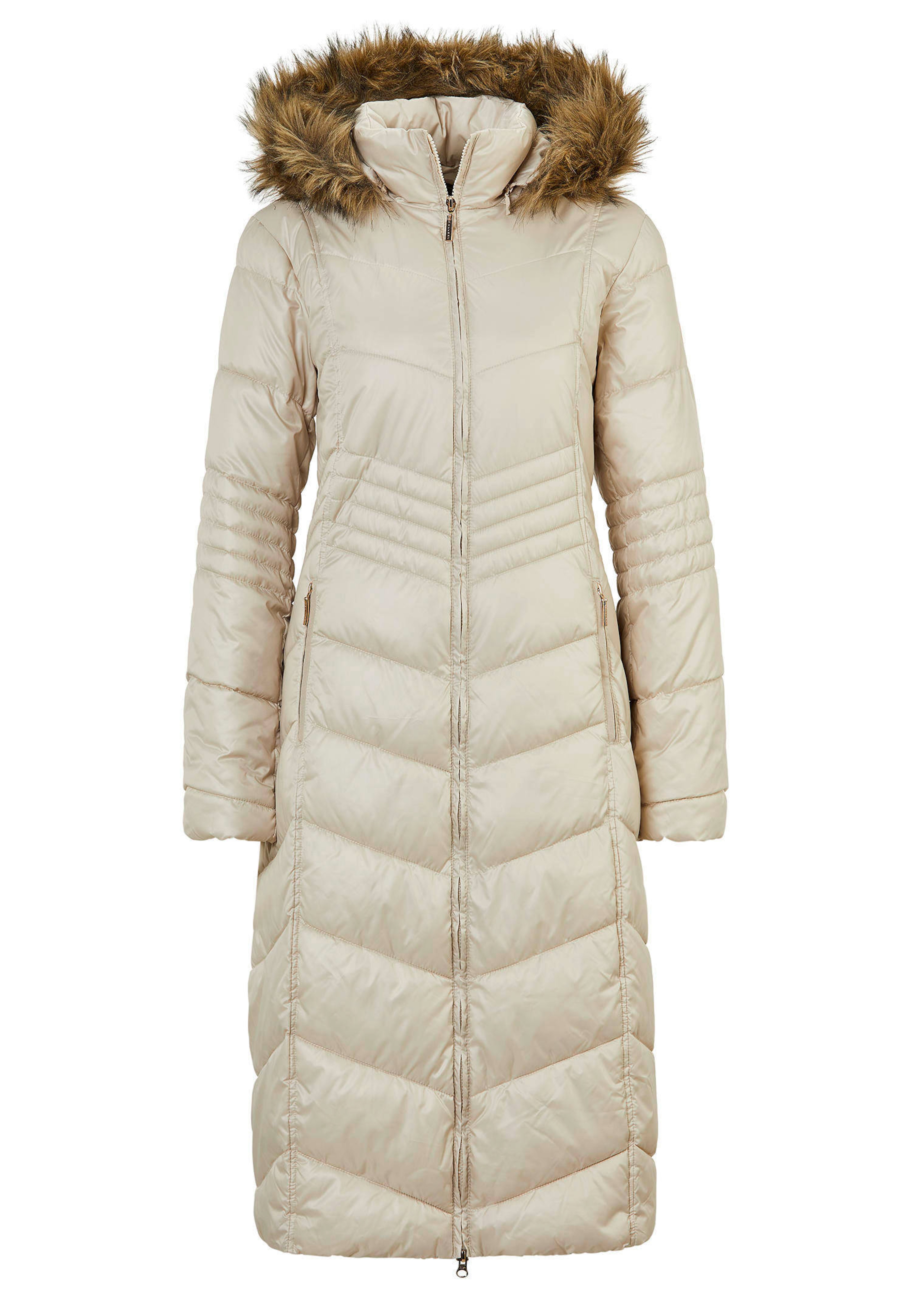 Steppmantel, der Sie wohlig-weich und warm umhüllt. Dabei trägt der Mantel nicht auf, denn die diagonale Chevron-Steppung mit schmalem Taillenstepp formt eine schlanke Silhouette. Die abnehmbare Kapuze mit Kunstfellbesatz ist ein echter Hingucker. Praktische Eingrifftaschen mit Reißverschluss verwahren sicher Ihre Wertgegenstände. Das knielange Modell ist mit einem 2-Wege-Reißverschluss zu schließen – so können Sie den Verschluss individuell regulieren und auch beim Autofahren bequem sitzen. Dieses Modell fällt eine Nummer kleiner aus. Bitte bestellen Sie die Jacke eine Nummer größer als gewohnt.