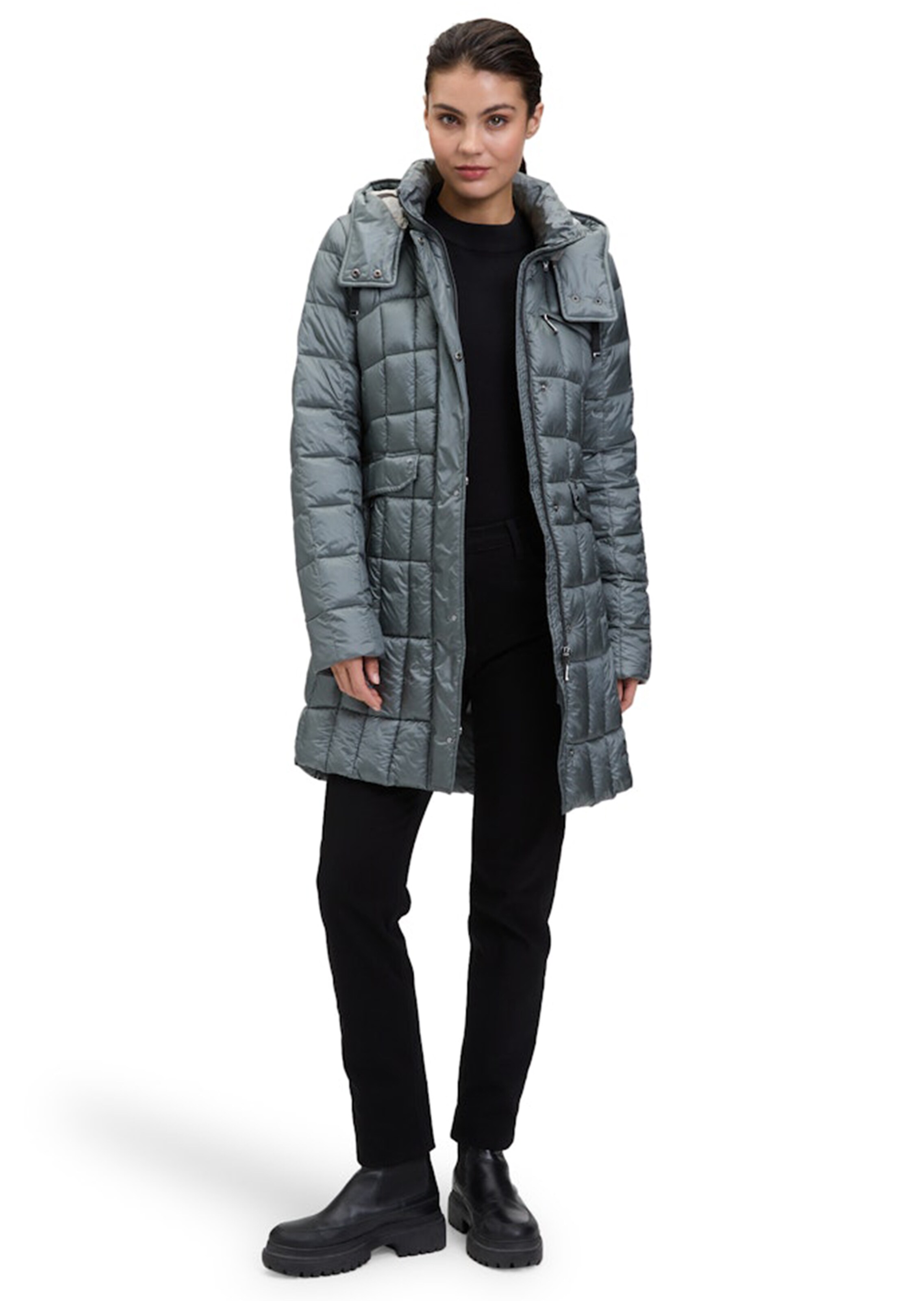 Steppmantel mit Kapuze von GIL BRET in dezent schimmernder Optik, dick gefüttert mit wärmender Kunstdaune. Das Modell besticht durch modischen Karo-Stepp und das karierte Kapuzenfutter. Je nach Wetterlage lässt sich die Kapuze auch abnehmen. Sowohl die warm gefütterten Eingriffstaschen als auch die Brusttasche sind mit Reißverschluss gearbeitet, dekorative Patten ergänzen den Look. Mit verdeckten Jersey-Bündchen am Ärmel und Druckknopfleiste über dem Reißverschluss als extra Kälteschutz. Ein rundum gelungenes Modell, das Sie in gerader Passform mit abgerundetem Saum warm durch den Winter bringt! Länge ca. 90 cm in Gr. 46.