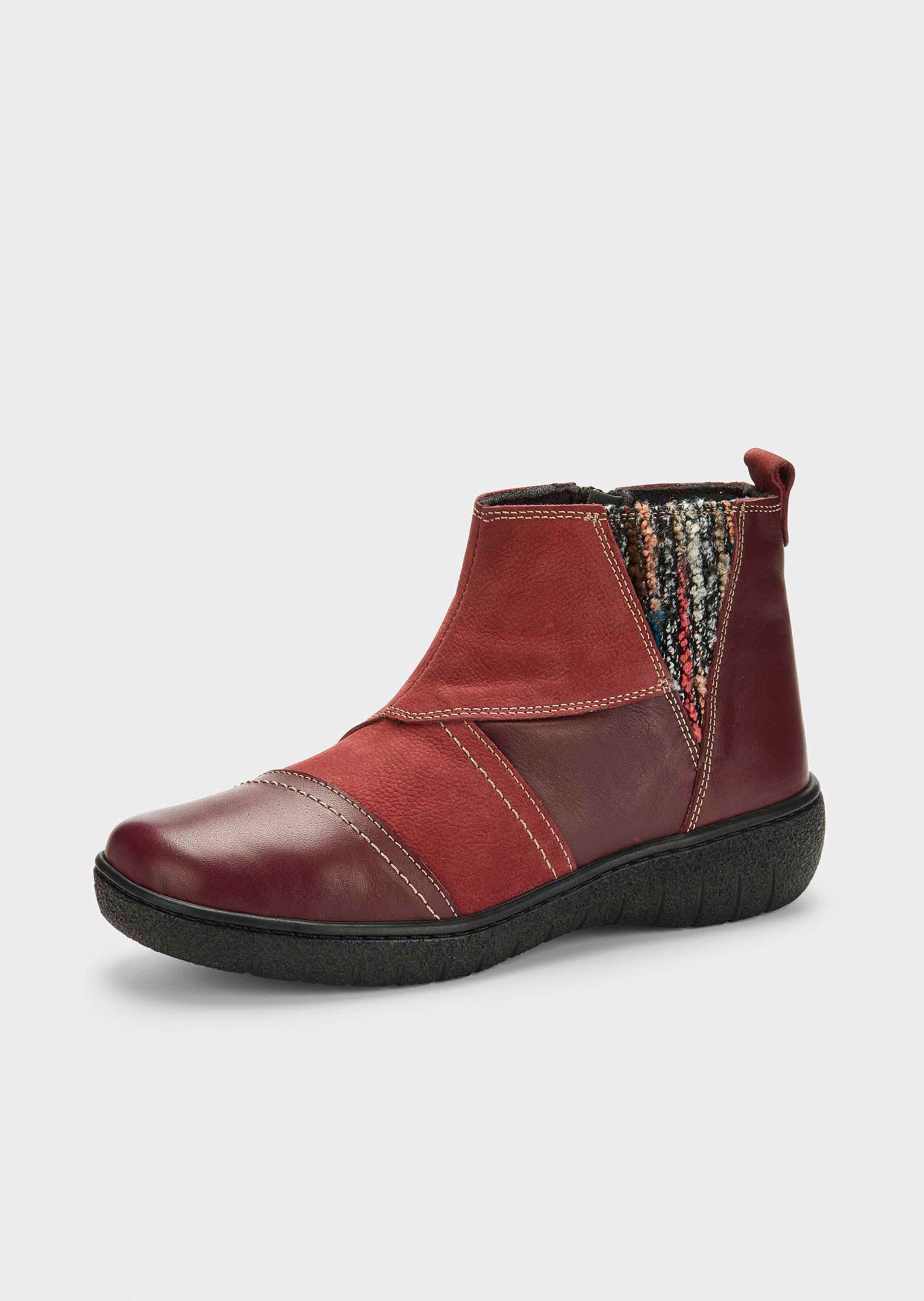 Stiefeletten in raffinierter Patch-Optik aus Leder und Bouclé. Nähte in Kontrastfarbe. Reißverschluss für bequemes Anziehen. Textilfutter und Wechselfußbett mit Lederdecksohle. Flexible PU-Laufsohle.