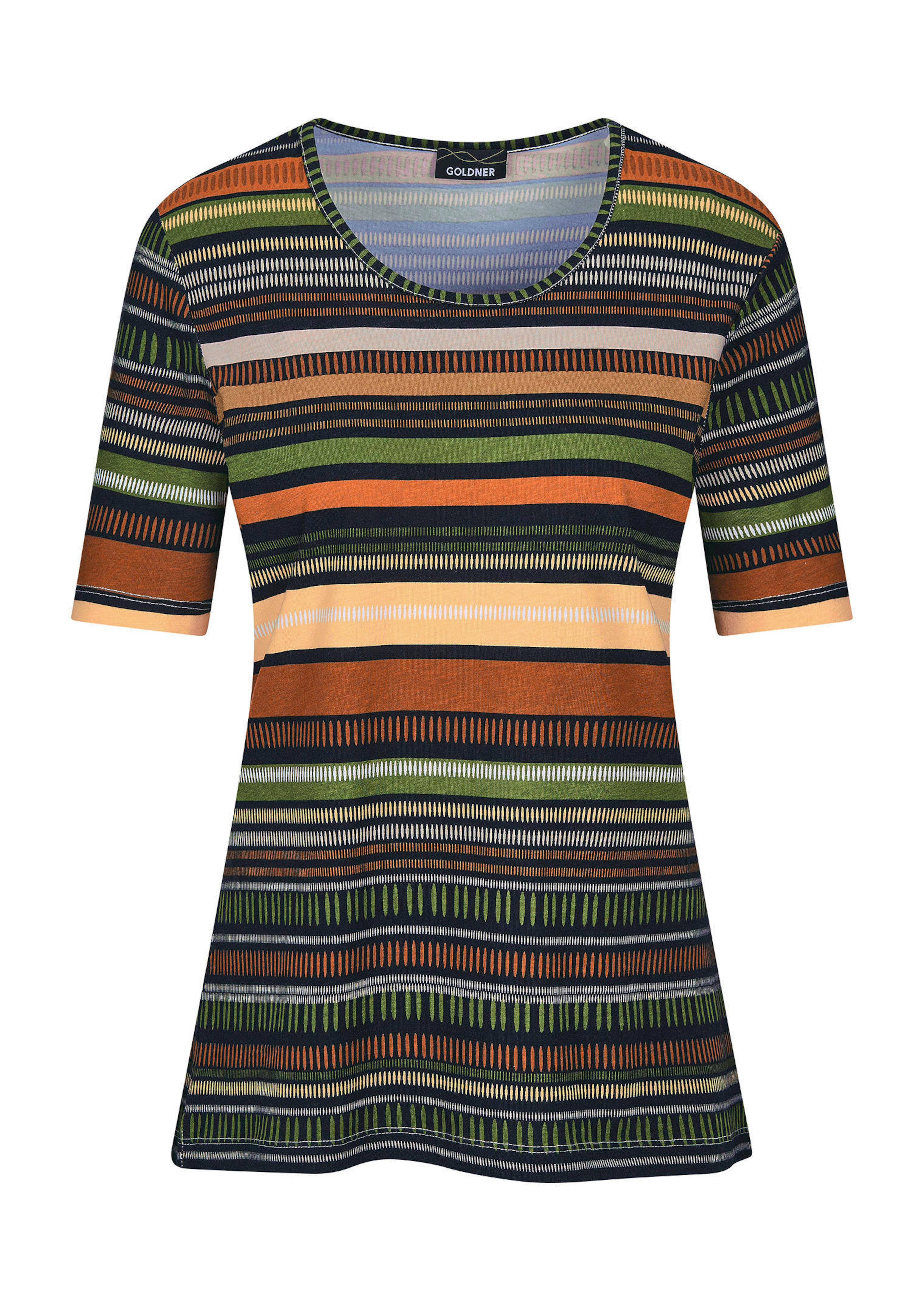 Shirt in farbharmonischem Streifendessin – perfekt kombinierbar zu Jeans, Hosen oder Röcken! In weicher Baumwoll-Modal-Mischung fĂ¼r besten Tragekomfort. Mit Rundhalsausschnitt und halblangen Ă„rmeln. Jedes Teil ein Unikat! Länge ca. 66 cm in Gr. 46, ca. 62 cm in Gr. 23.