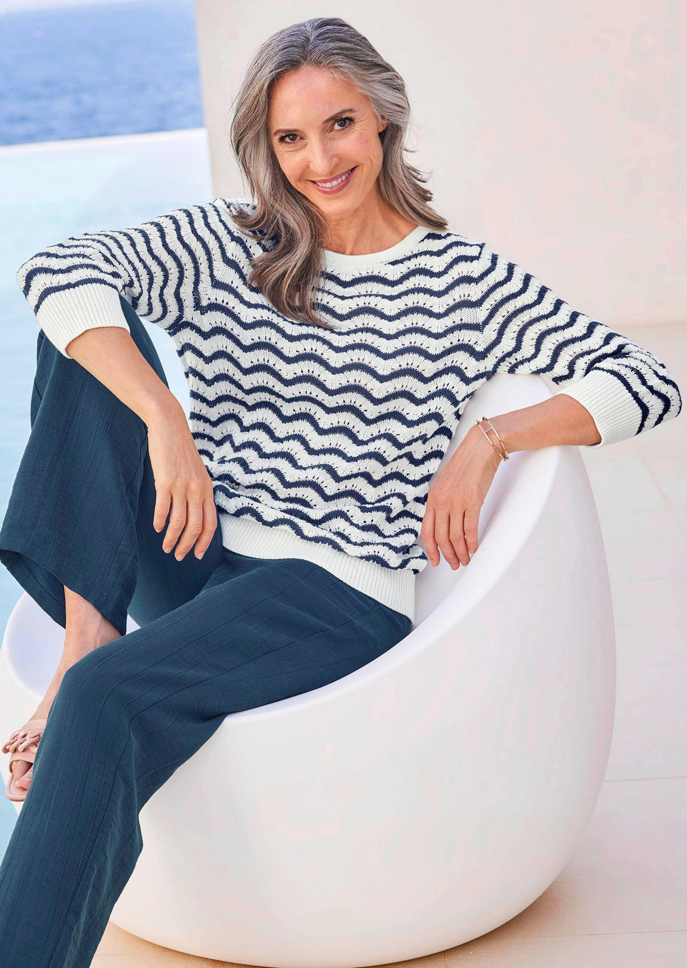 Strickpullover mit elegantem U-Boot-Ausschnitt und unifarbener Blende, die über das Vorder- und Rückenteil bis über die Schulter zum Armloch verläuft. Die Highlights dieses pflegeleichten Pullovers aus einer Baumwollmischung sind die ansprechende, zweifarbige Ringeloptik und die hochwertigen Ajourdetails. Mit unifarbener Rippe an Ärmel- und Leibsaum, 3/4-Arm und gerader Passform. Länge ca. 67 cm in Gr. 46, ca. 63 cm in Gr. 23.