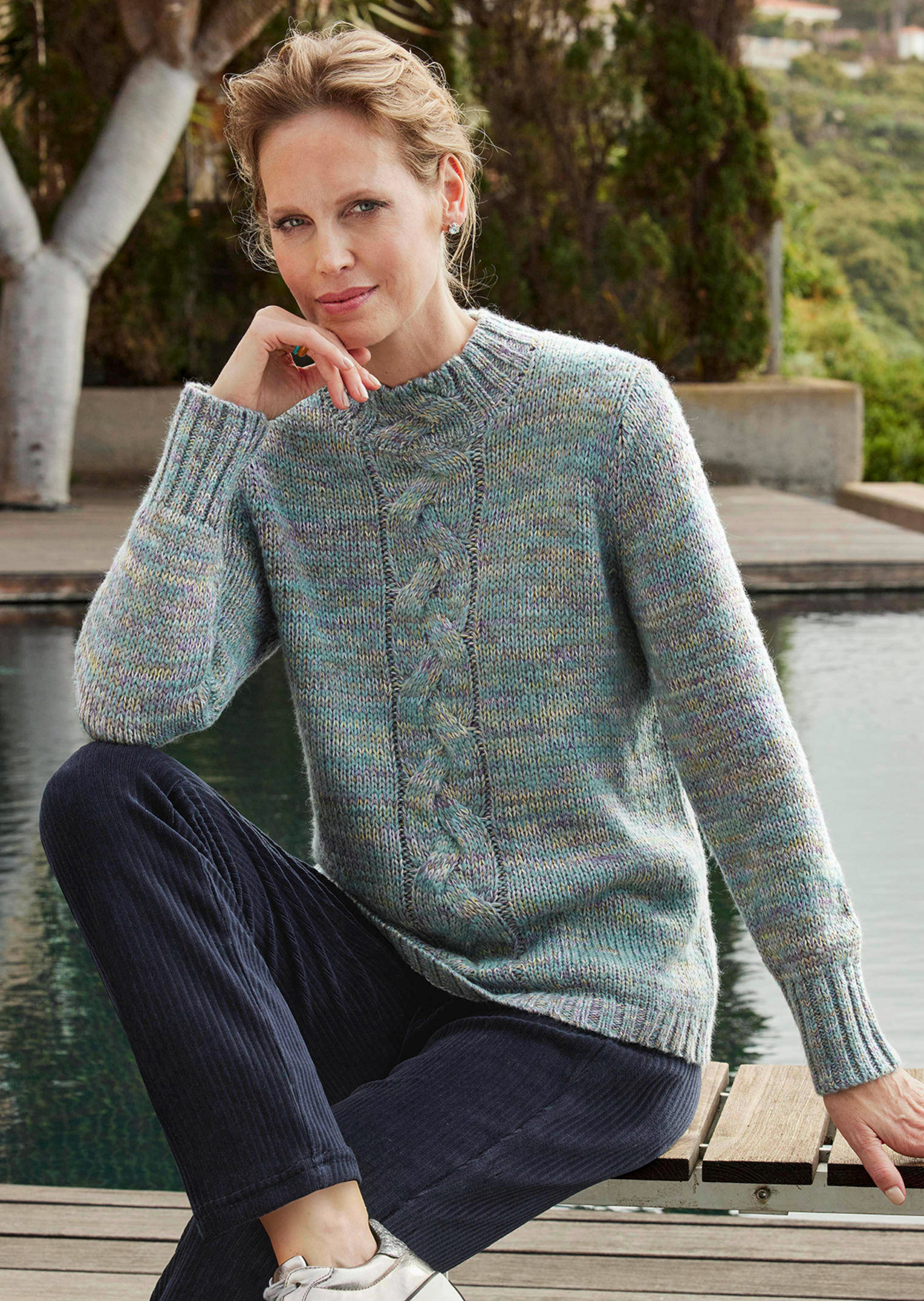 Strickpullover in superweicher, pflegeleichter Garnqualität mit attraktivem Farbverlauf in Melange-Optik. Das Zopfstrukturmuster in der vorderen Mitte wirkt streckend und läuft bis in den Stehbundkragen weiter. Ärmel, Saum und Stehbundkragen mit schöner Rippenstruktur – an den Ärmeln verlaufen die Bündchen höher. Länge ca. 67 cm in Gr. 46, ca. 63 cm in Gr. 23.